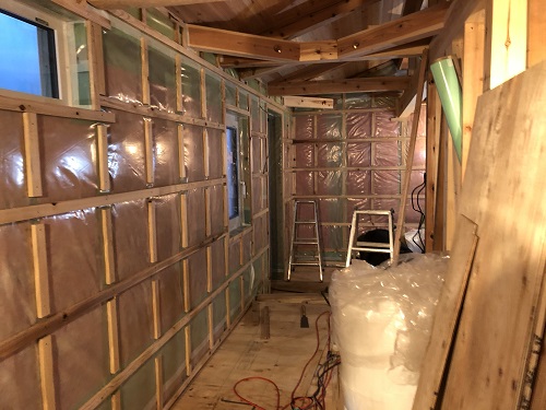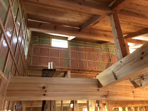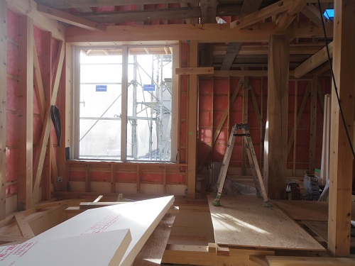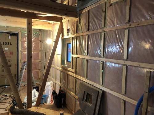 防湿工事後の胴縁下地の取り付けも進み、電気配線を待って防火構造の石膏ボードを張り込む準備が出来ました。