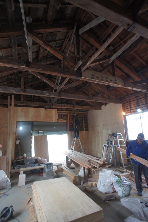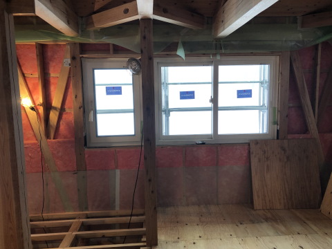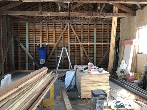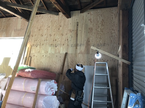 雫石の新築現場では、隣接する倉庫の筋違いが規定外の指摘なので、構造用面材を張り込んでの耐震改修を進めています。こらが出来上がると、工事用の倉庫として今後大活躍してくれる予定です。