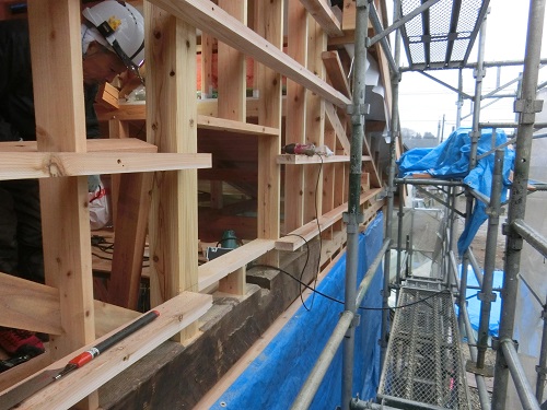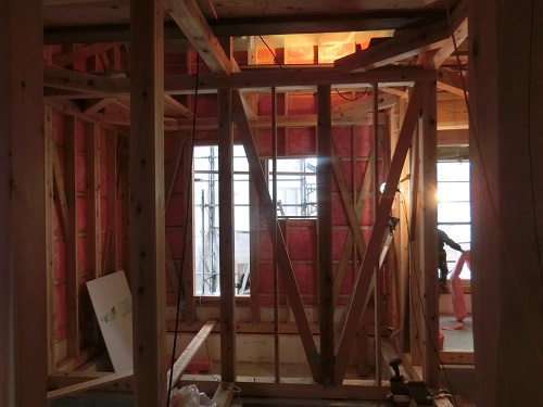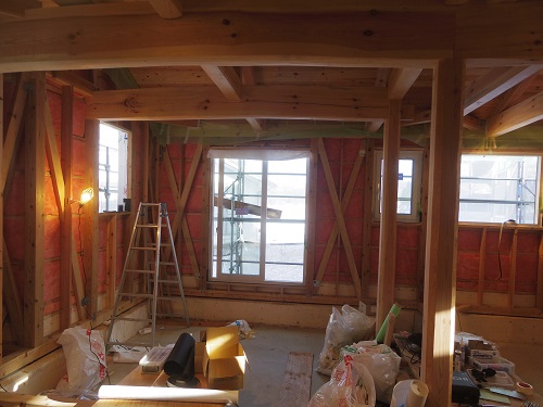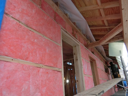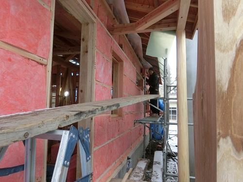 外部胴縁取り付けも進み、年明けの外壁工事準備も進みますが、その前に内部壁断熱と電気配線を追える必要があります。