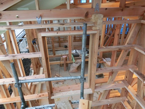 雫石の新築現場は、外部を完全に囲い終えて、外壁下地の墨付けなどの段取りが進んでいます。