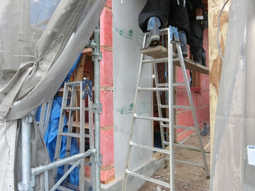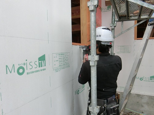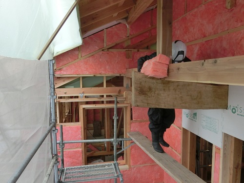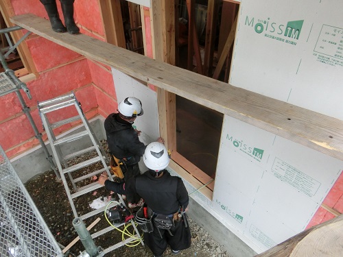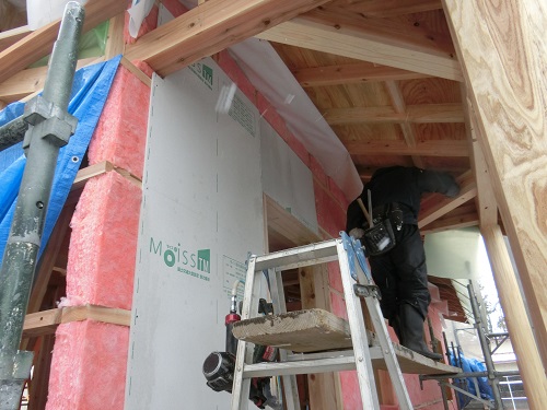 応援が合流して、付加断熱と防火構造面材の張込みが進みました。