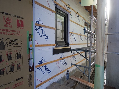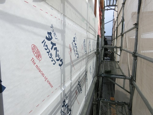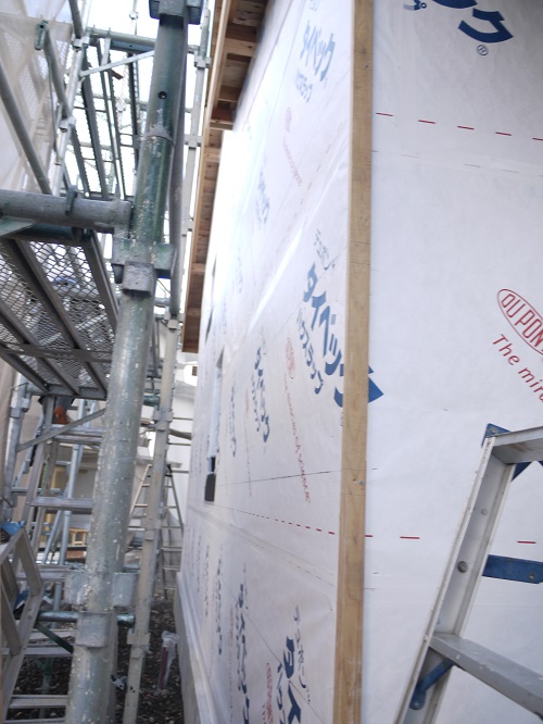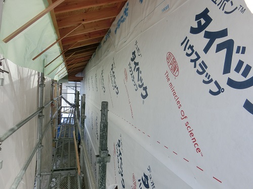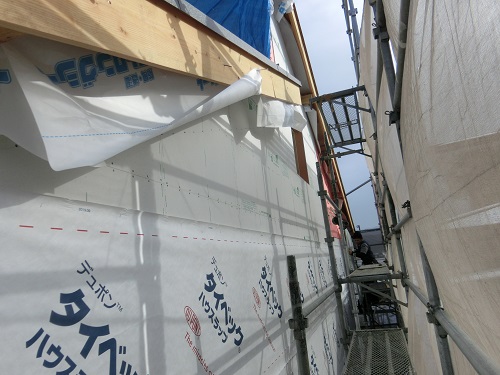 付加断熱と防火面材の張込みと防湿防水シートの張込みが同時に進みましたので、外部を囲い込んで一安心です。来週は同様に上田堤の新築現場を大勢で推し進めます。