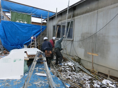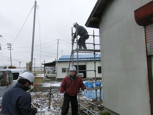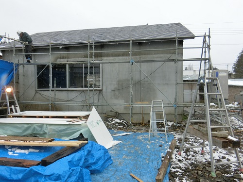 岩泉の外壁工事を終えて、足場を岩泉から運んで雫石の既存小屋の改装用に足場を組みました。