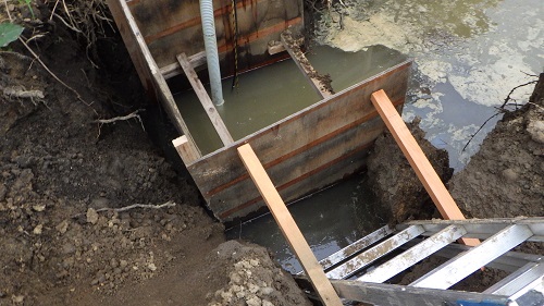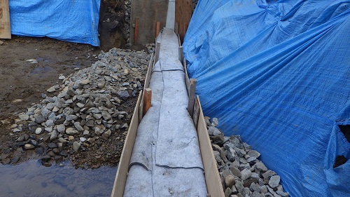 水が湧いて困っていた基礎工事ですが、相変わらず水が流れています。でも、罐場を設けて暗渠配管して、ポンプ置き場が出来てきましたので、工事をどんどん進める段取りが出来ました。