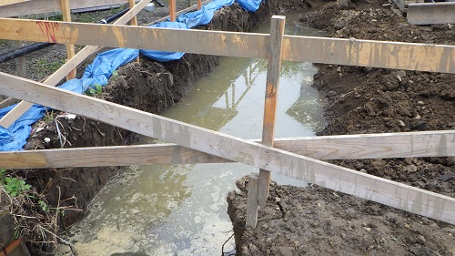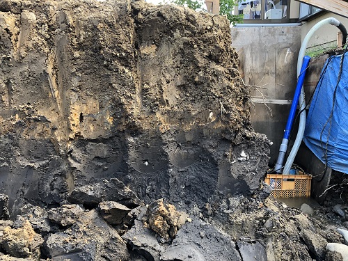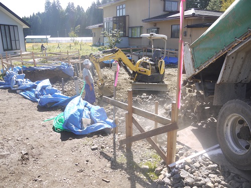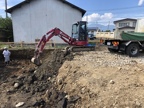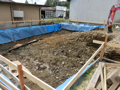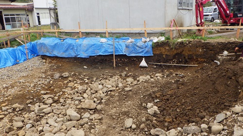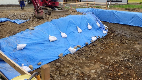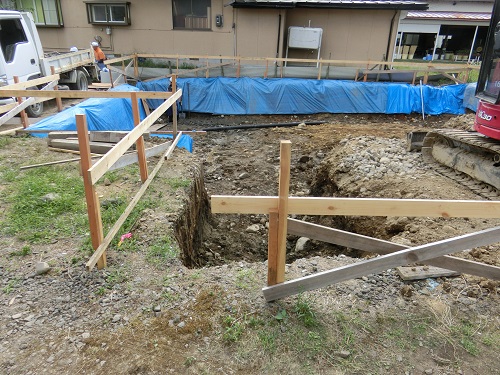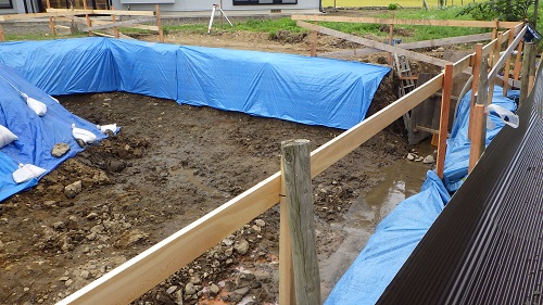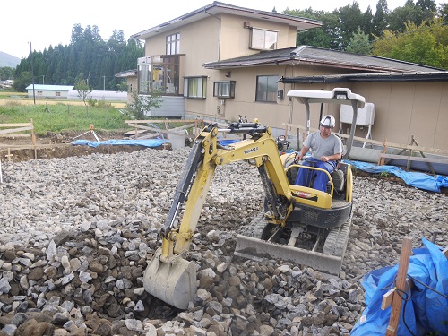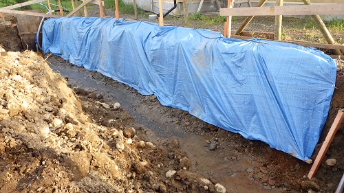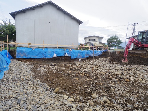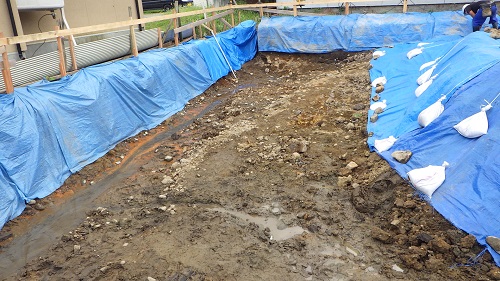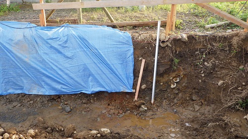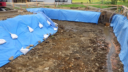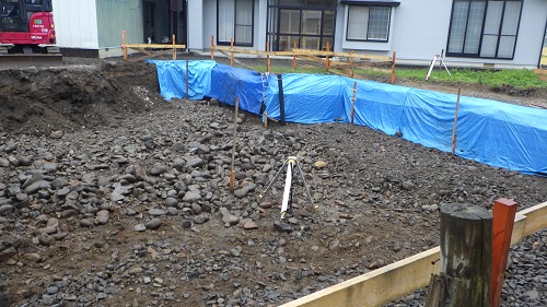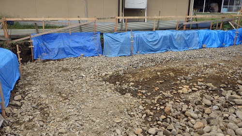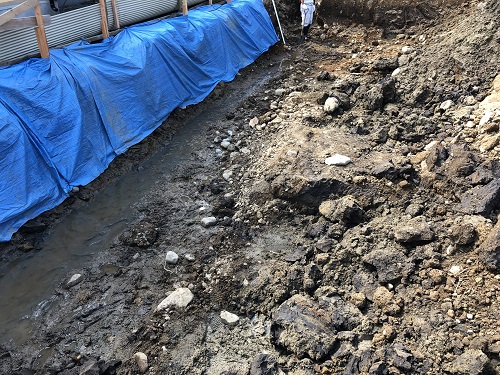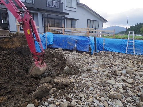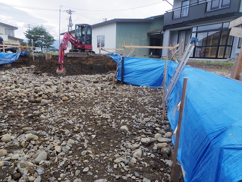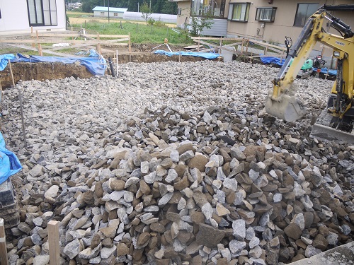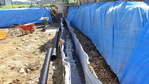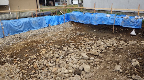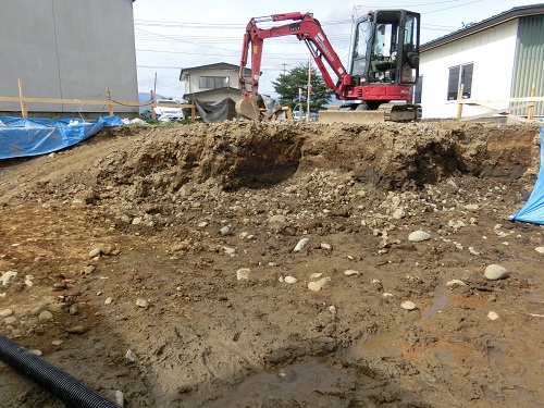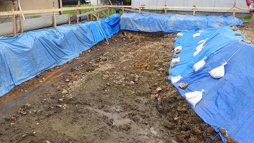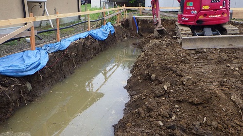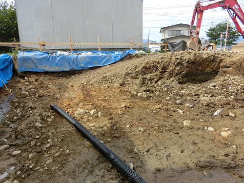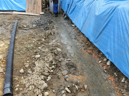 基礎を開始して、土を掘り上げると大量の雨水が湧きだしてしまい、苦戦していますが、何とか水を汲み上げての排出が進んだので、暗渠配管して岩ズリを入れ込んで頑丈な地盤に置換したいと思います。