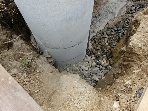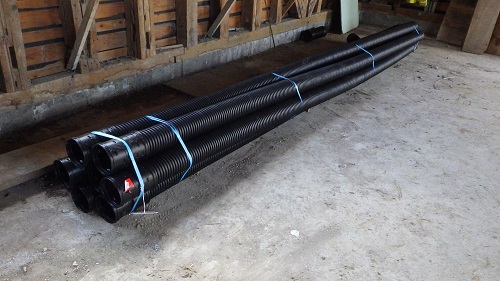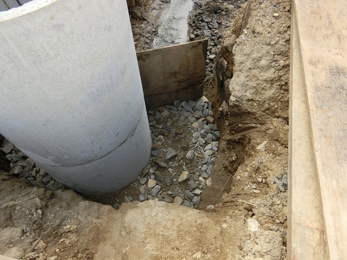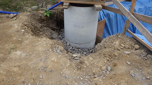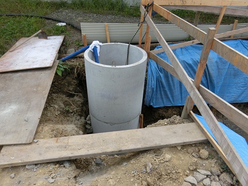 水が湧いていた基礎工事現場ですが、大分汲み上げて落ち着いてきました。暗渠管と窯場用のヒューム管の準備も出来ています。