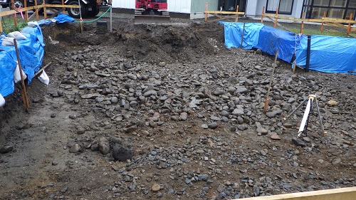 掘り上げた土に混ざる玉石を取り除けて再度基礎下に戻してから砕石置換工事を進めようと思います。水は相変わらず湧いてきています・・・