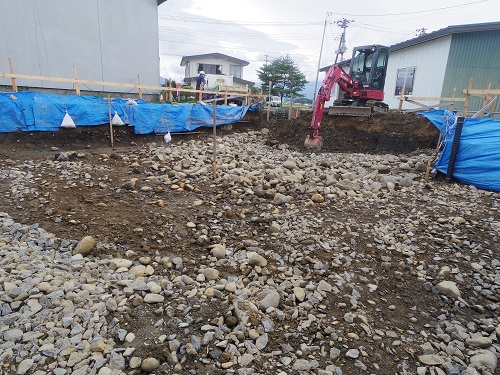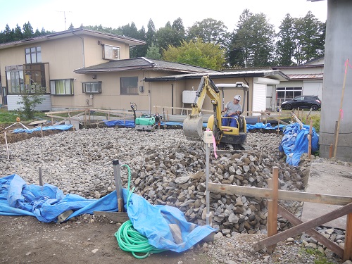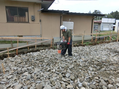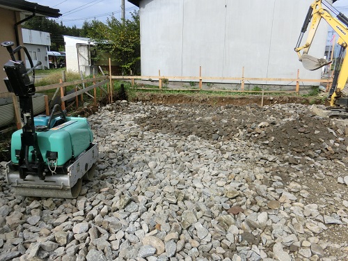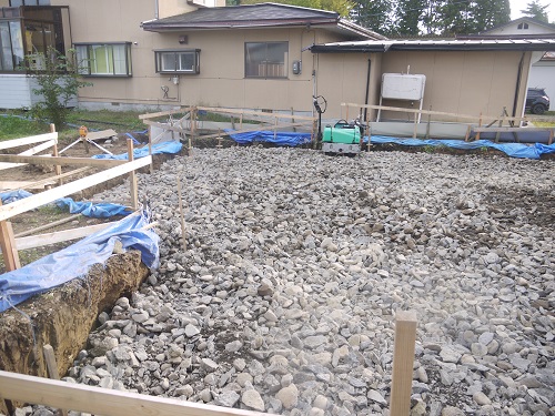 砕石置換部の突き固めが進んで頑丈な基礎底盤が出来上がりました。