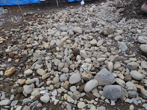 今週は、最後の土出しまで時間を費やしてしまいましたが、相当軟弱で弱い土を輩出して、写真の通りの玉石だけを元通りに戻して、来週からは岩ズリや砕石を搬送して突き固めたいと思います。