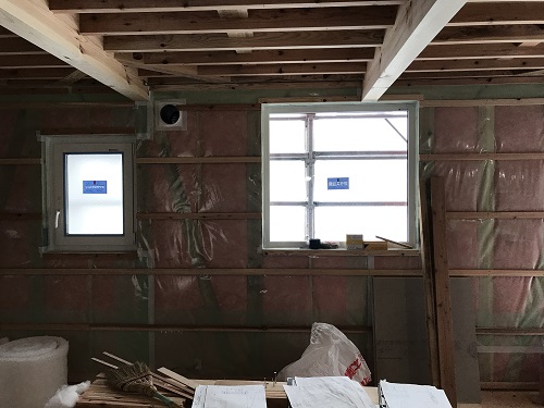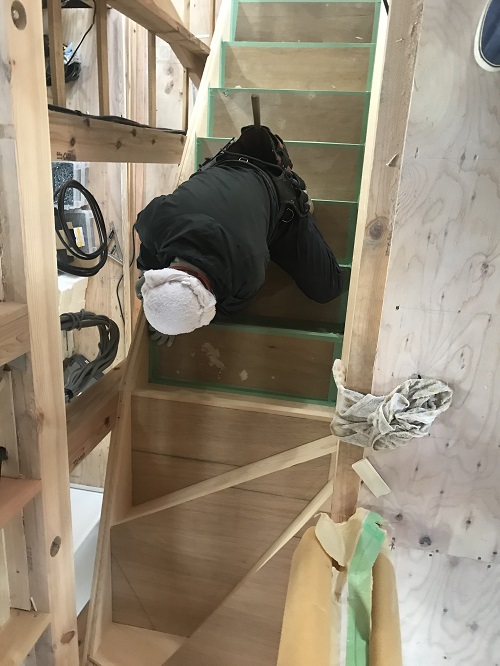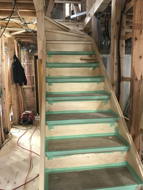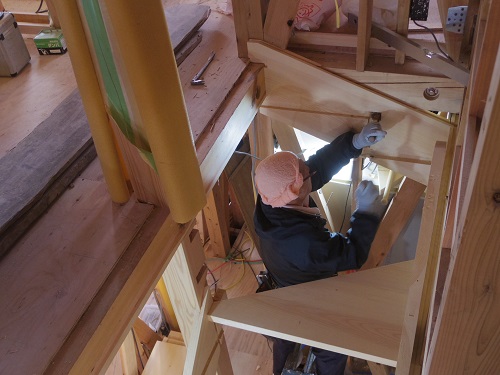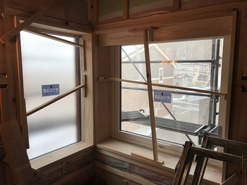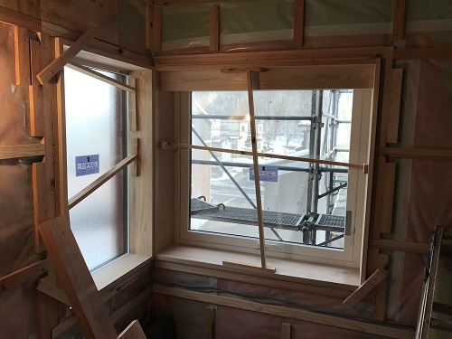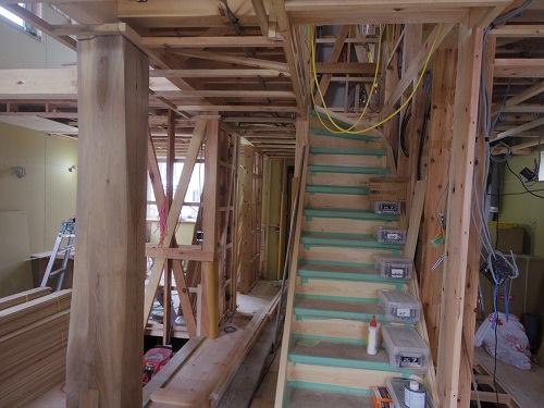 階段工事と窓枠の取り付けも始まった新築現場です。