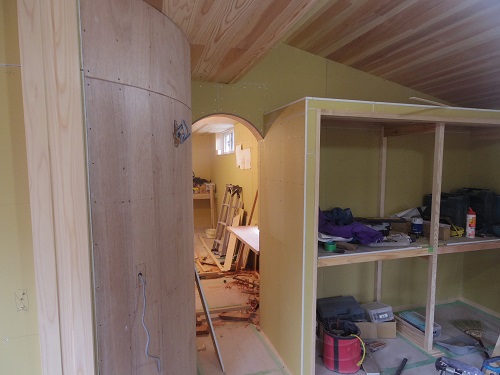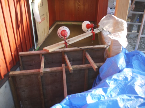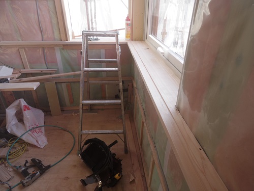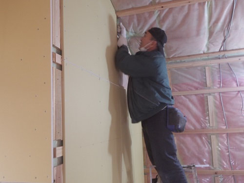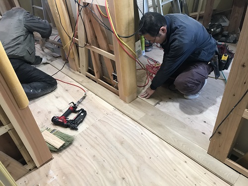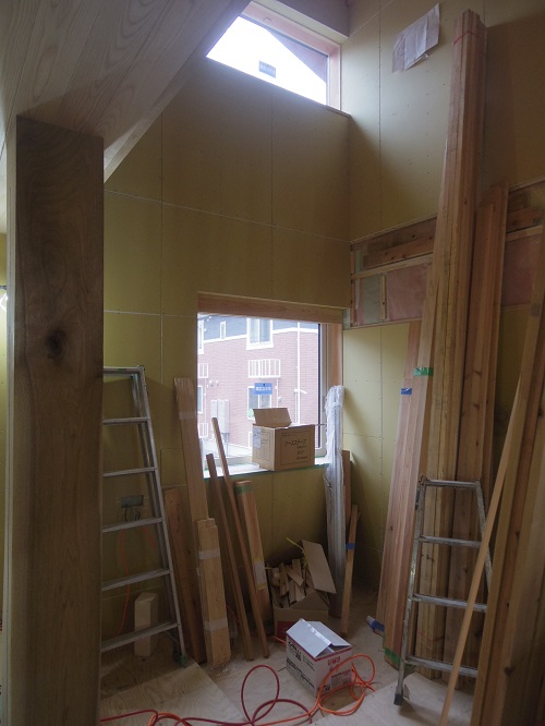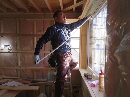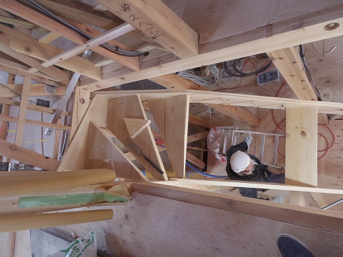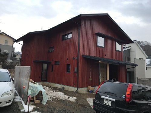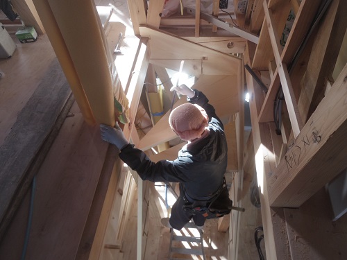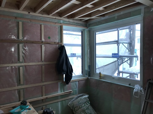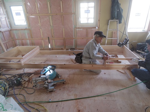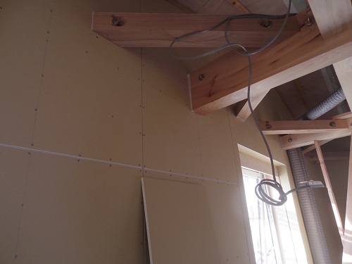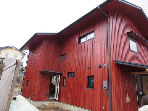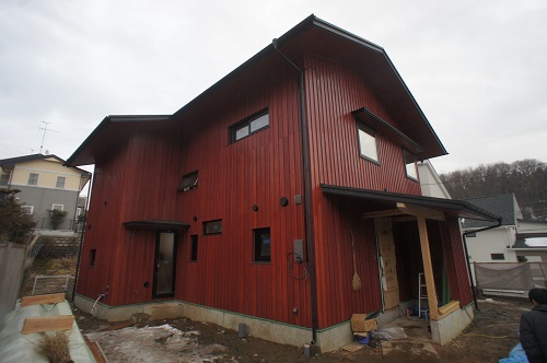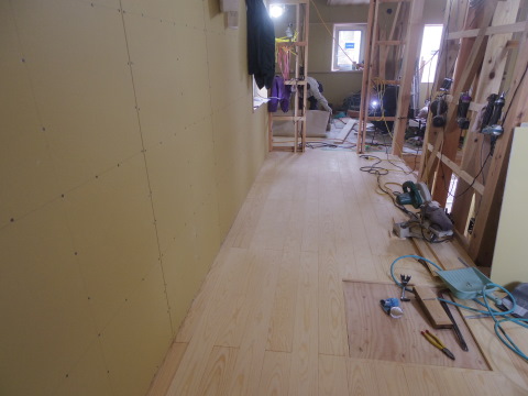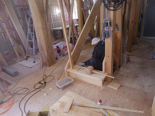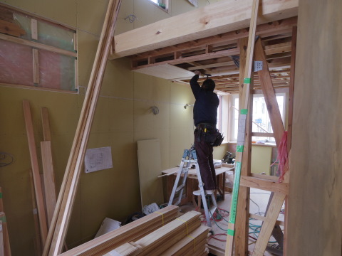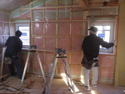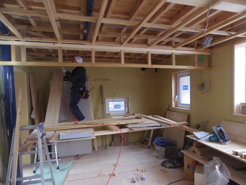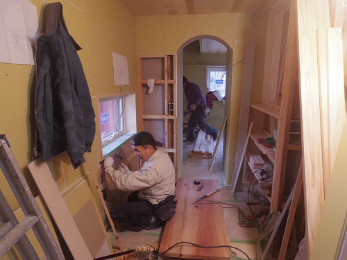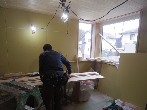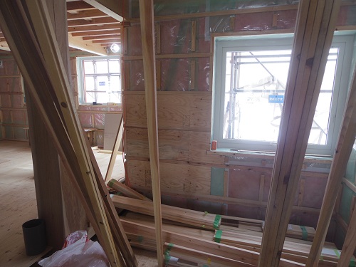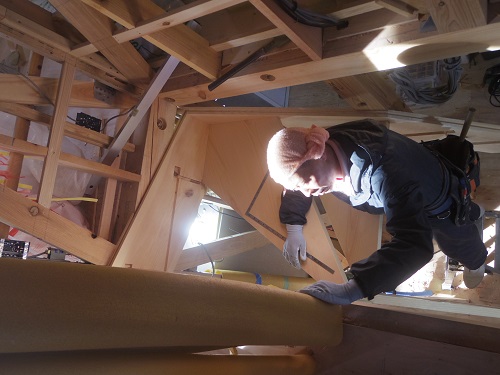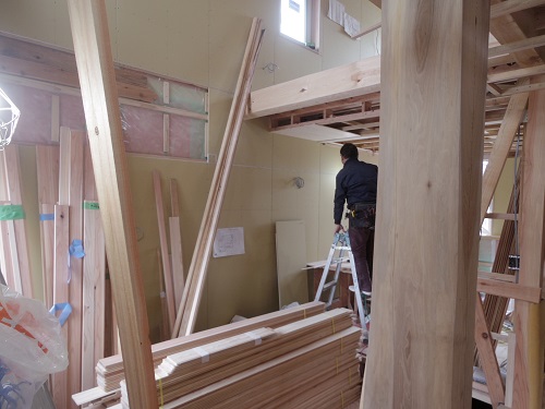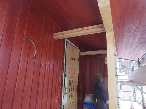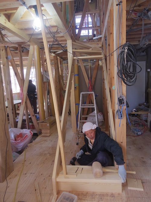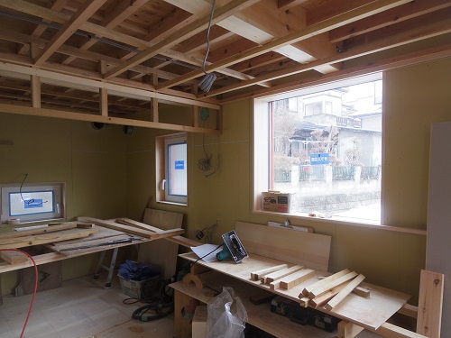 まだ2月半ばが過ぎたばかりですが、春のように暖かいので、外部工事がすんなりと進みました。内部では大工工事が生き生きと頑張っています。
