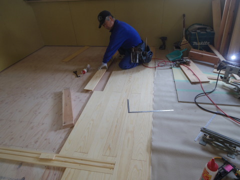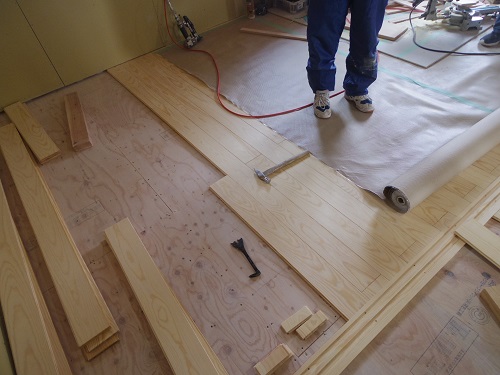 赤松の床は、経変変化で飴色に光り輝きます。張ったときはこんなに白いのにとても不思議なものです。