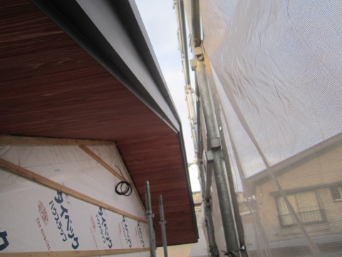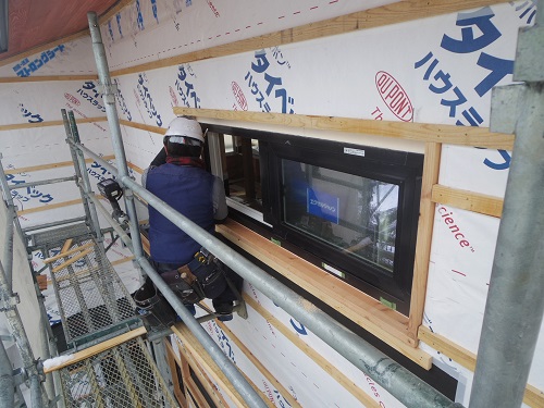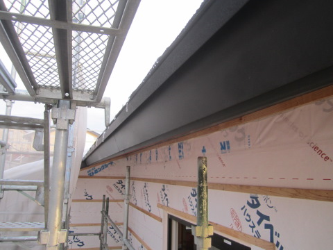 外部では外壁の板を張る前に各部の水切り板金の先付けが進行中です。