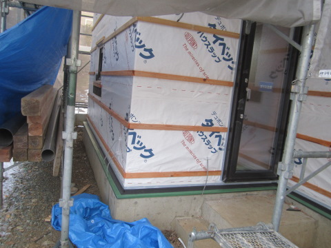 外壁工事が玄関先の一部残して完了し内部の防湿工事が進んだ新築現場です。