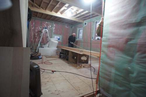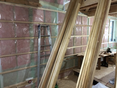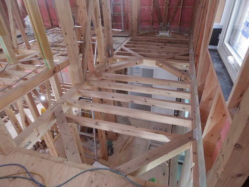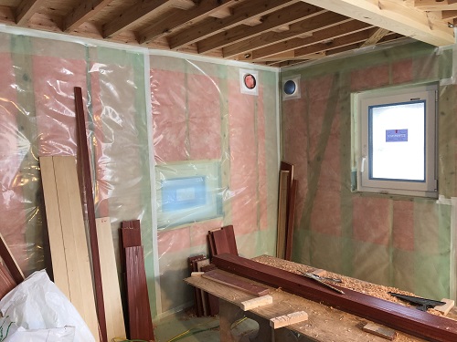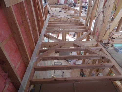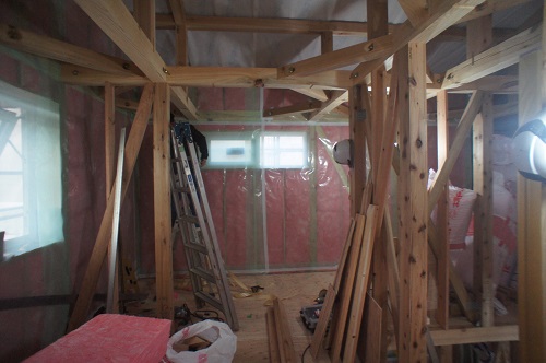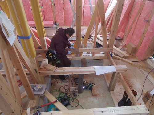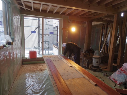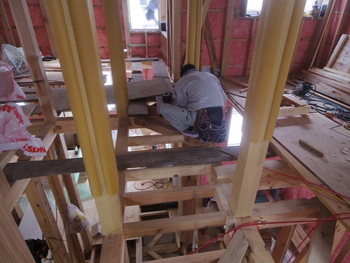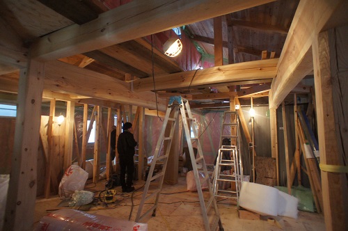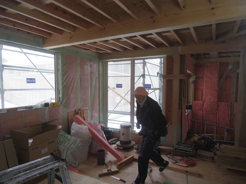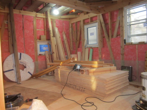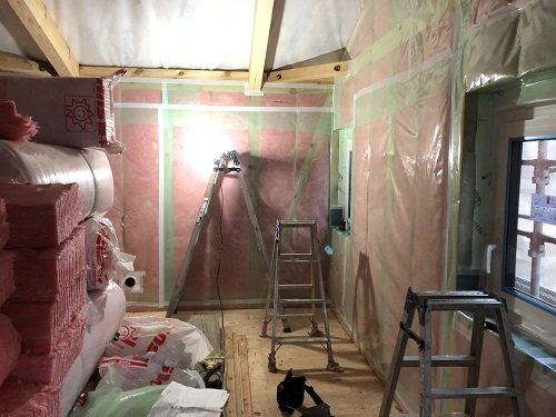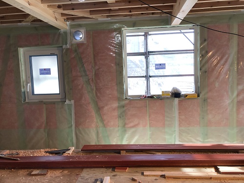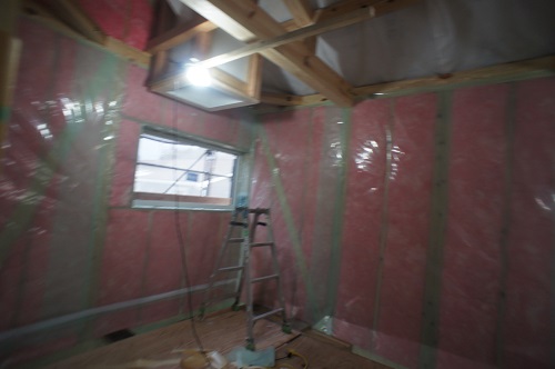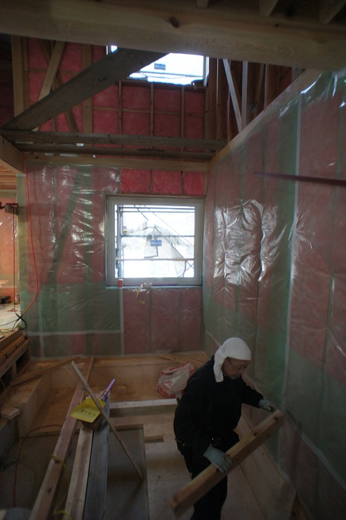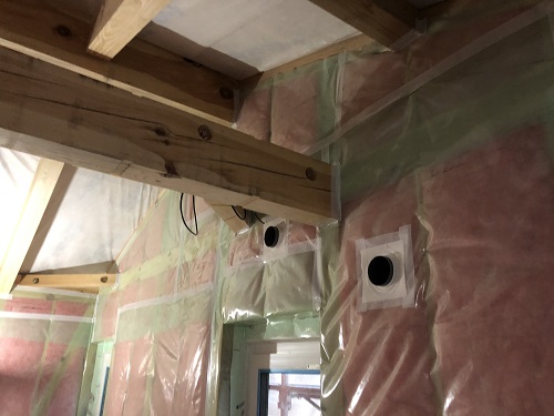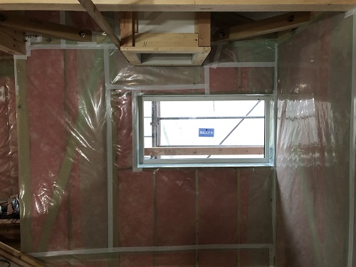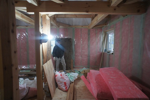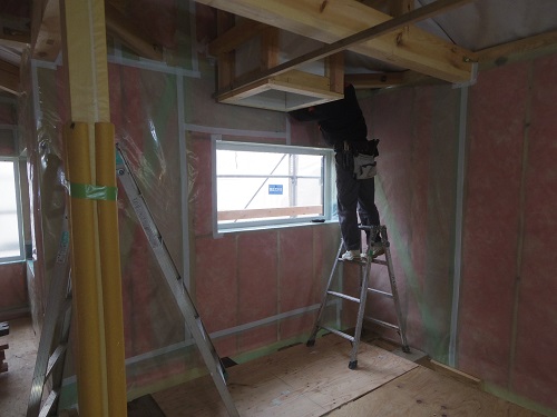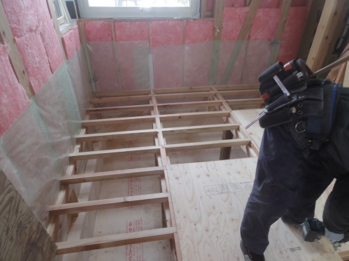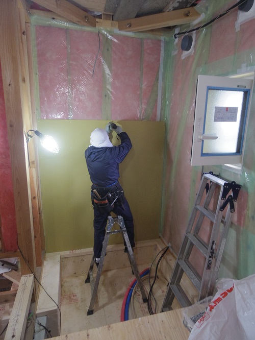 UBの設置工事前に後からは出来ない防湿シートと防火構造の石膏ボードの張込みや床組みも出来ました。