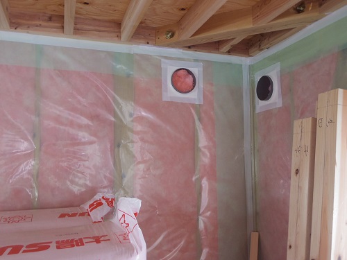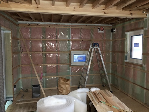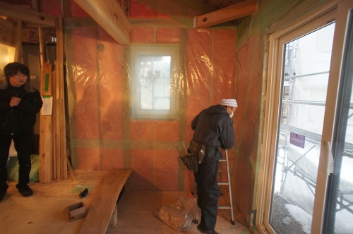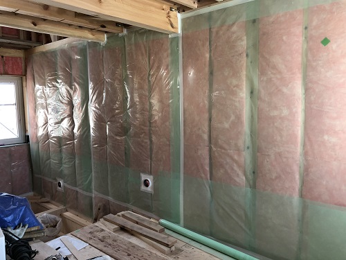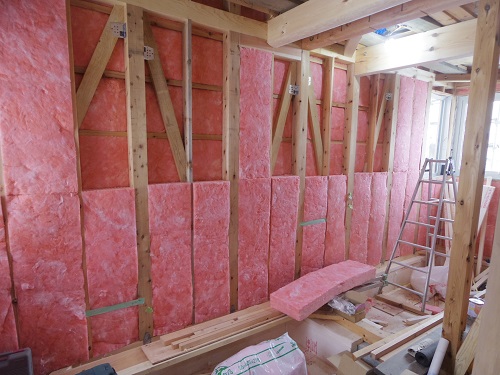 内部の壁断熱120mmが充填されて、外部の付加断熱100mmと合わせて220mmの壁断熱となります。