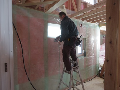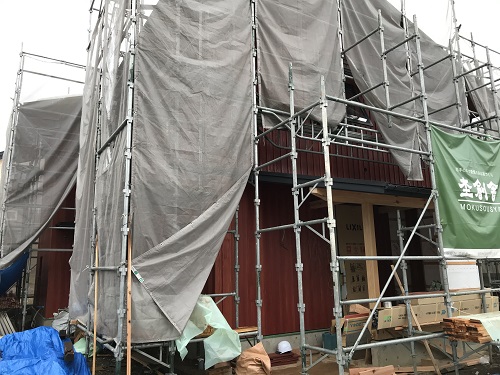 順調に外壁工事が進む新築現場の進捗です。内部は防湿工事も進みました。