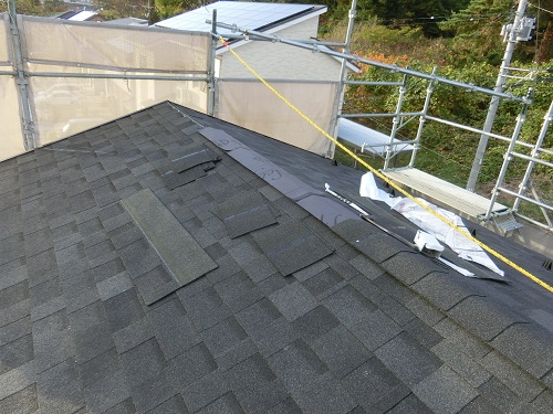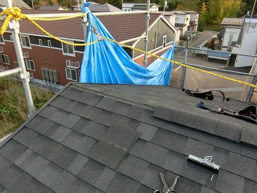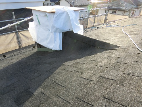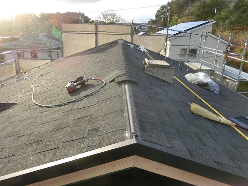 昨日の上棟式は雨でしたが、その後雨が上がり好天の下で屋根工事が棟包まで無事完成しました。