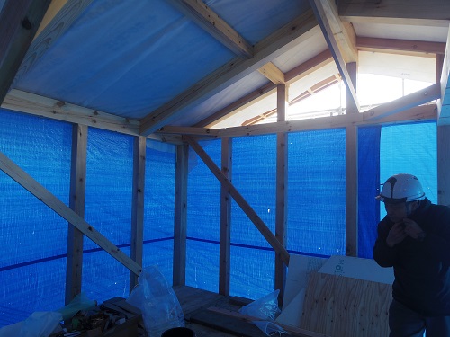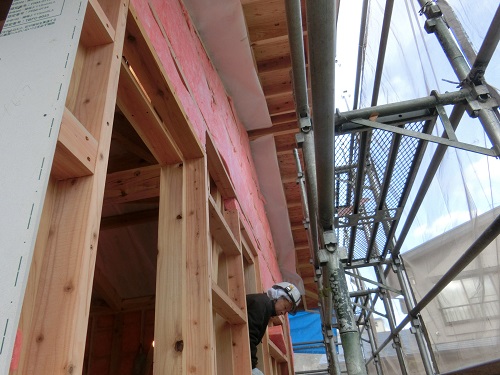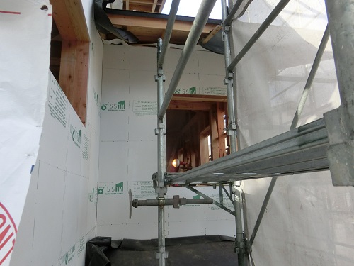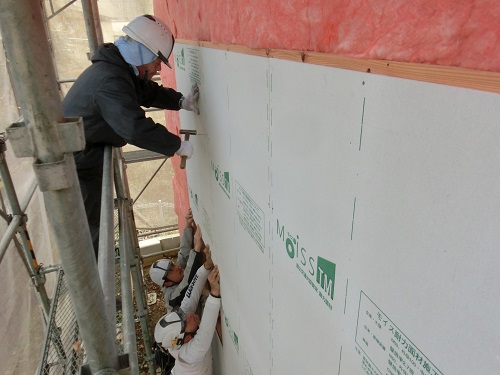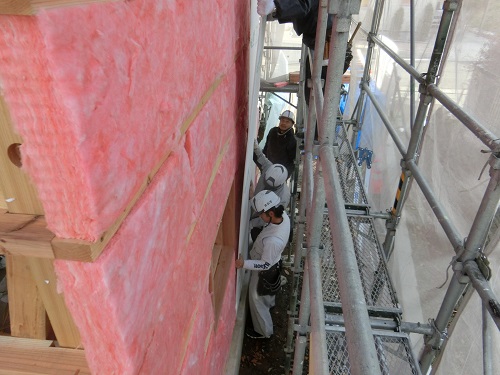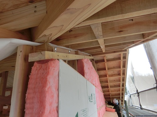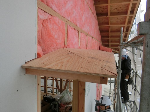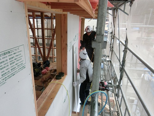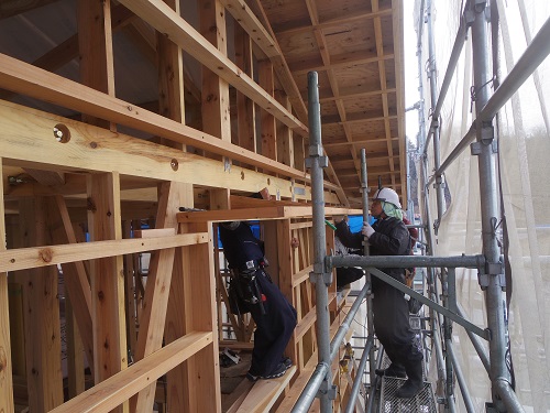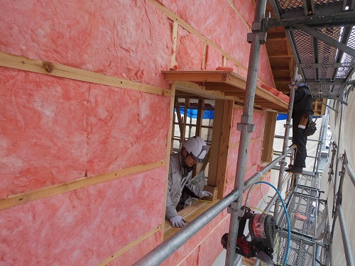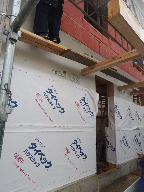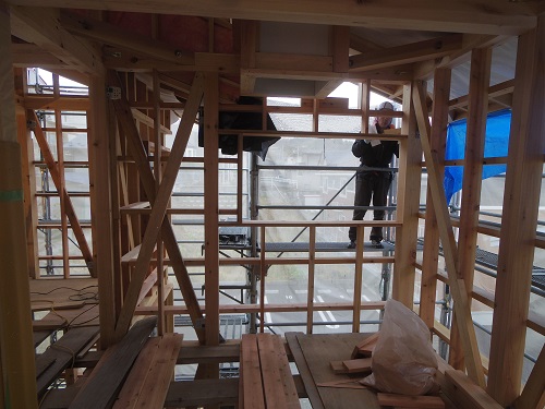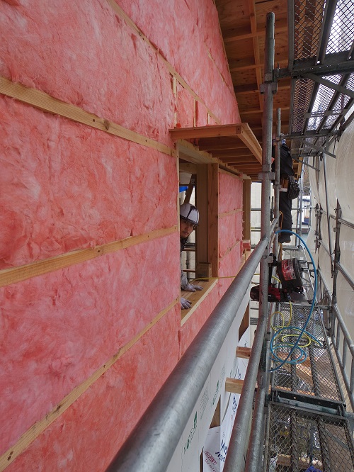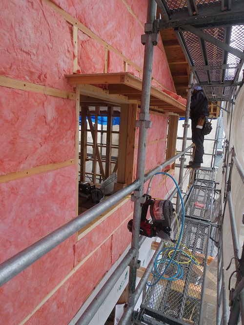 ここまで進むと次は外断熱(付加断熱)へと進みますが、断熱を入れ込むと直ぐに防火構造面材張りとセットになりますので、応援人数が欲しくなります。
