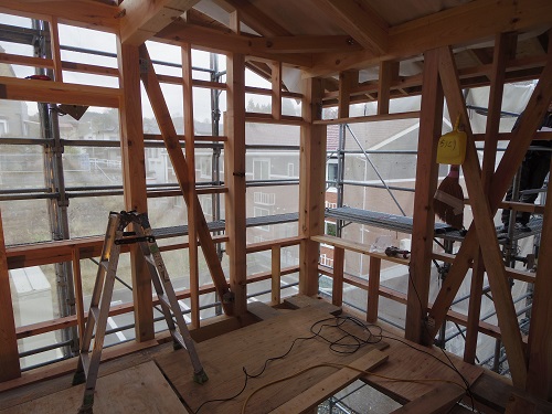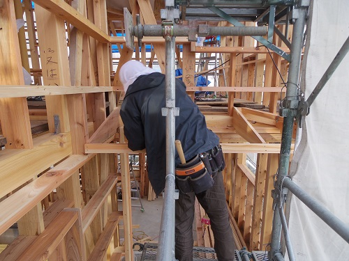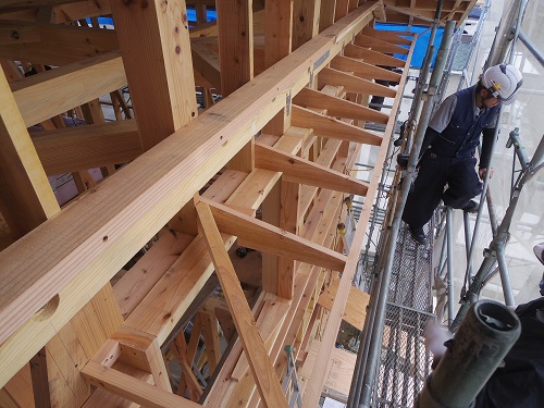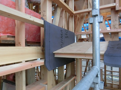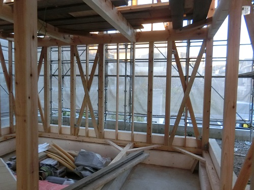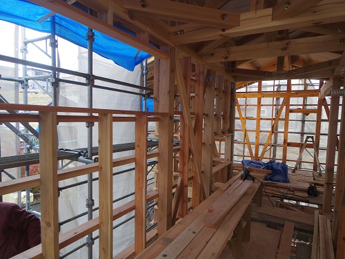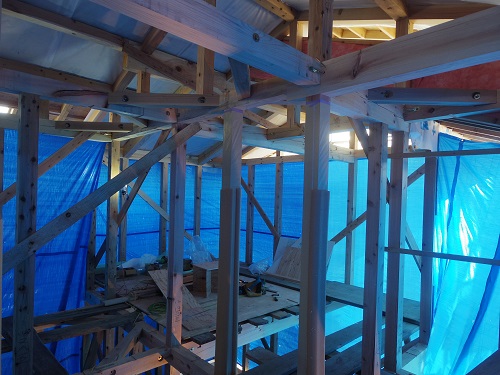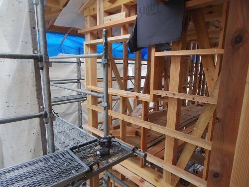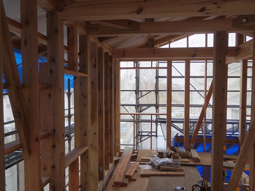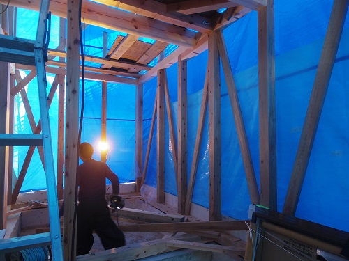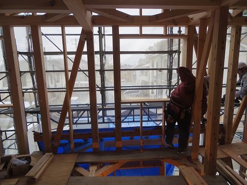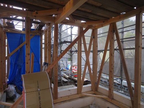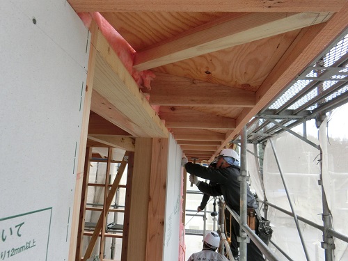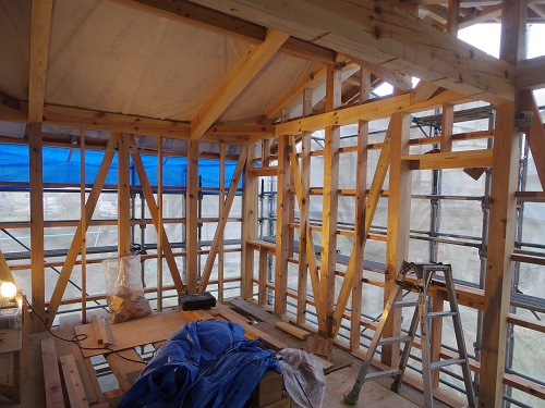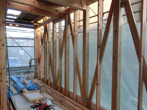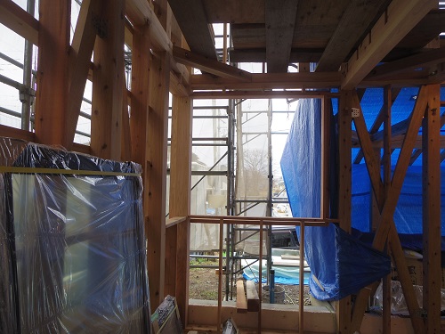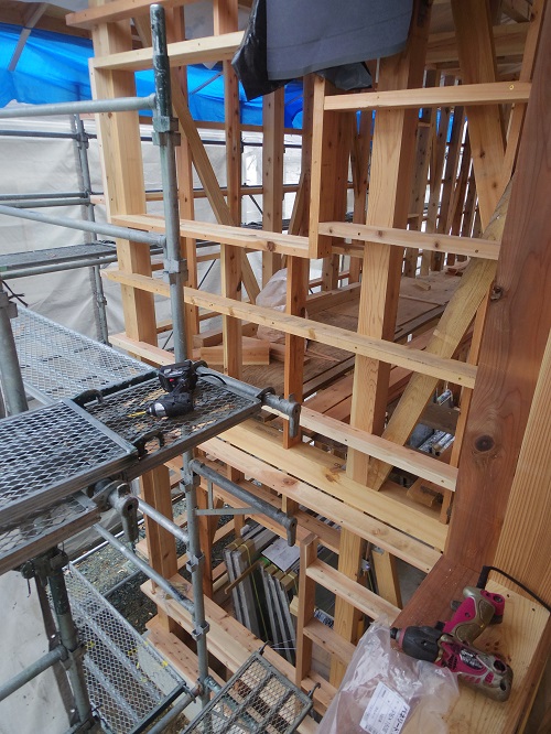 ここまで進むと次は外断熱(付加断熱)へと進みますが、断熱を入れ込むと直ぐに防火構造面材張りとセットになりますので、応援人数が欲しくなります。