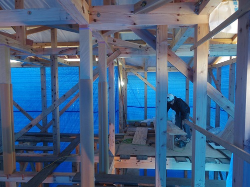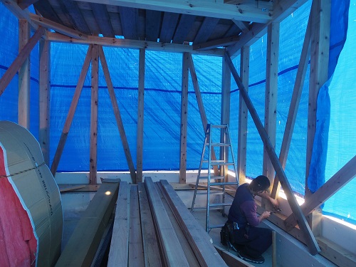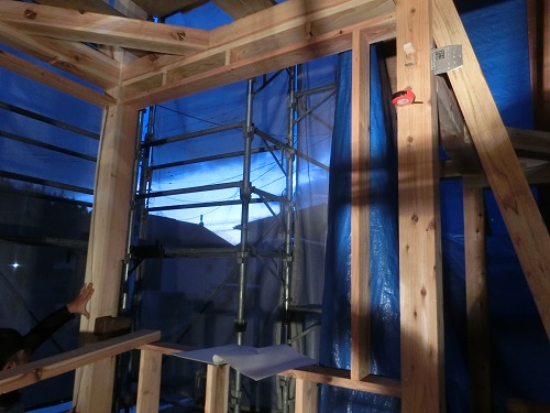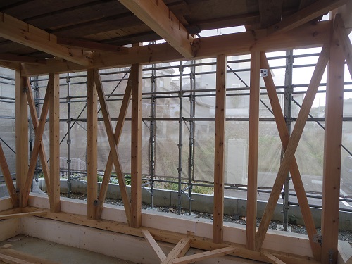上田堤の新築現場では、付加断熱を行うための窓下地組工事が進みました。