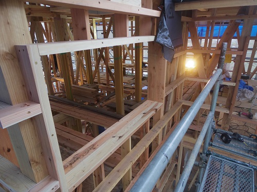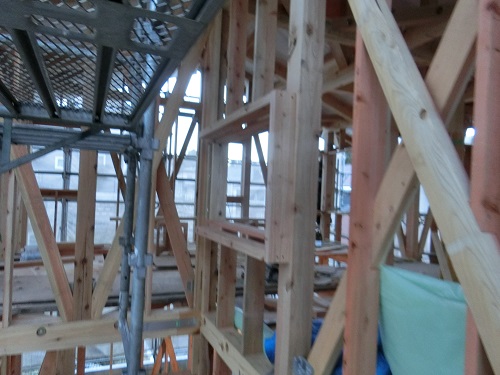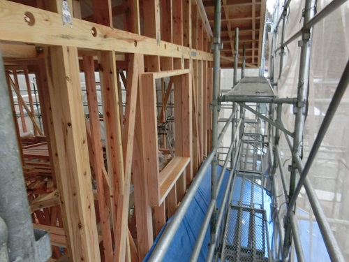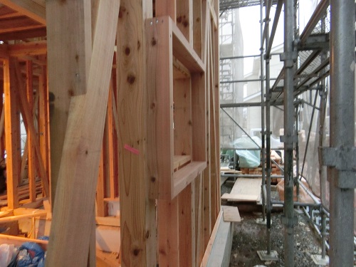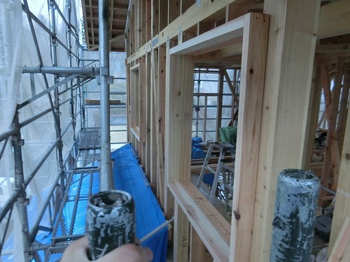 外断熱を進める為に窓台や間柱の取り付けが進む新築現場です。