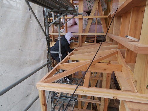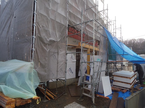 外断熱の下地が進んで次は庇の取り付けを進めてから断熱と防火面材工事へとの流れで進めている様でしたが、その日の内にはそうした工事まで一部進めています。ただ、冬の天候変化に苦労しながら取り組む大工メンバーでした。