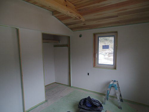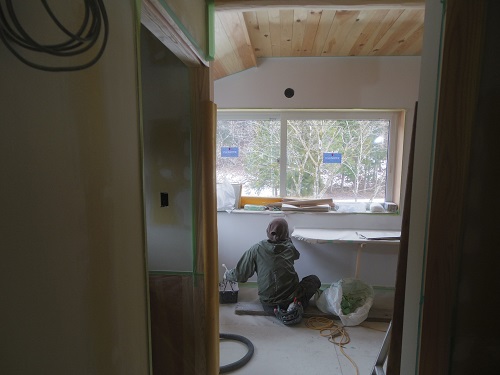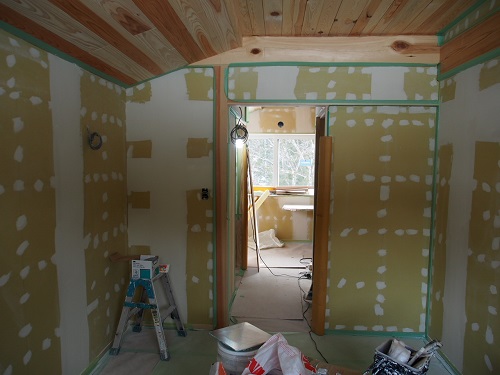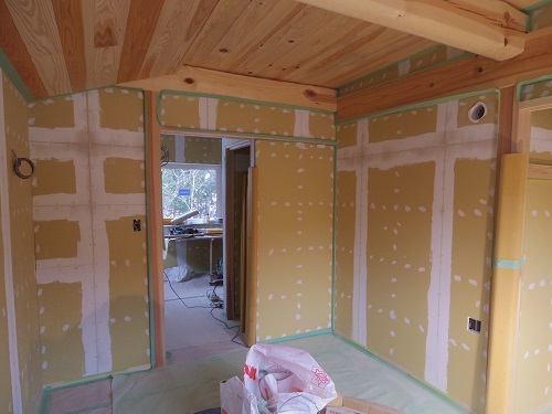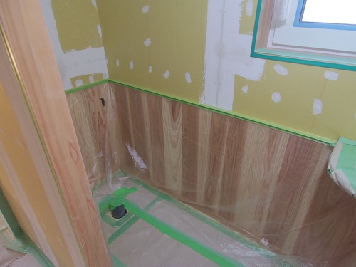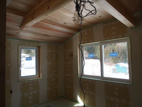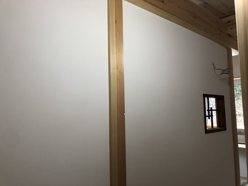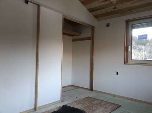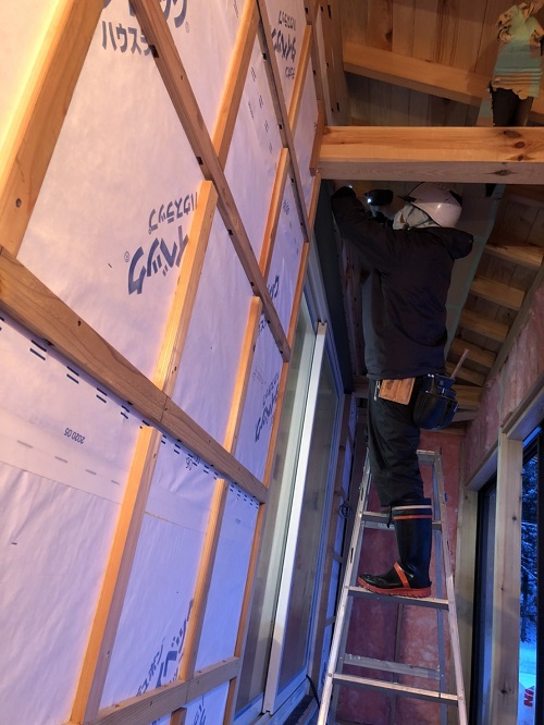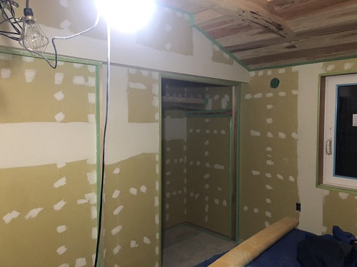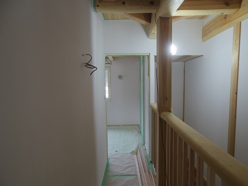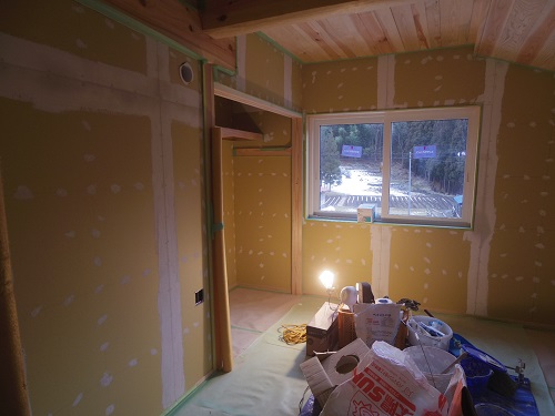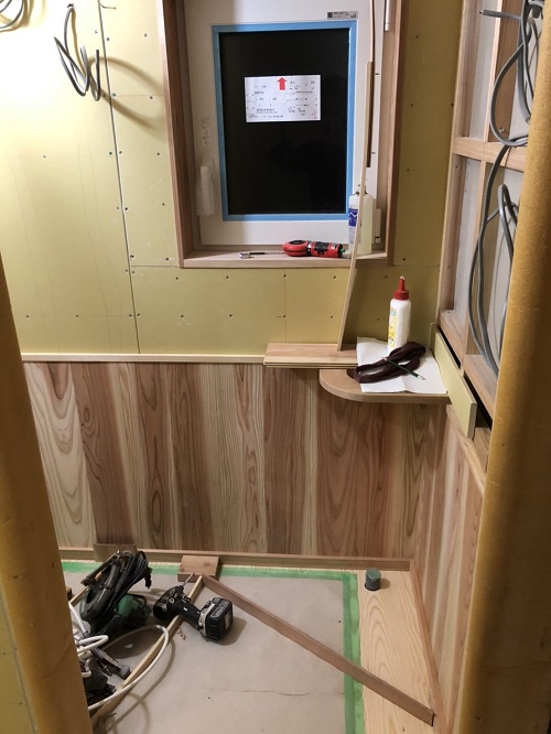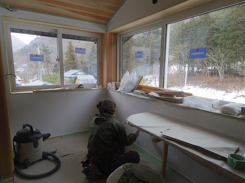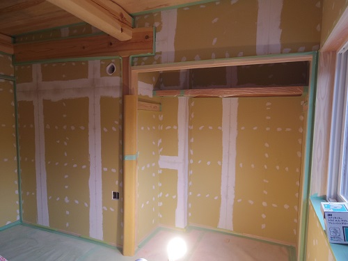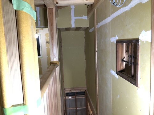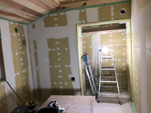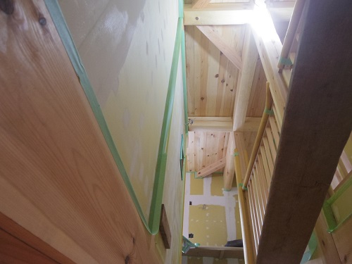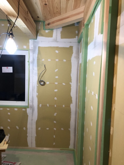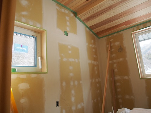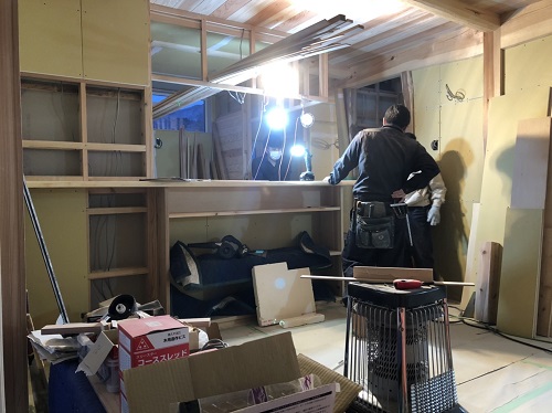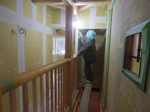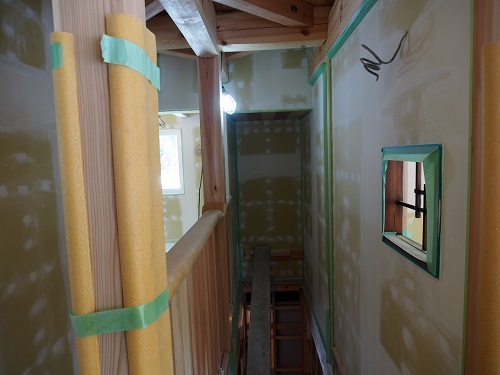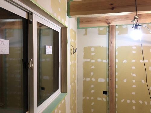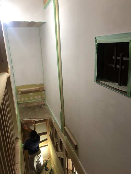 先輩の熟練大工が造作枠を取り付けて、若手大工がつかさずボードを張り込みながら素早く工事が進んでいます。2階の内装工事のパテ打ちも進んでいます。
