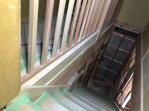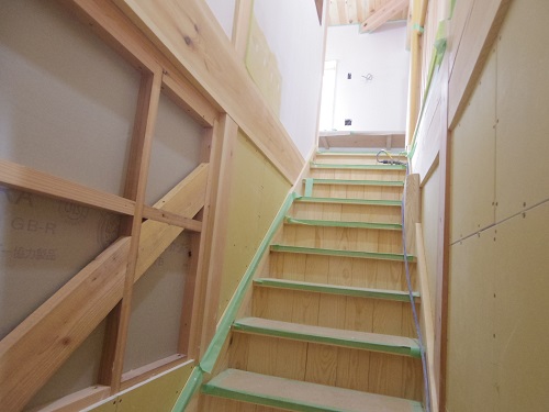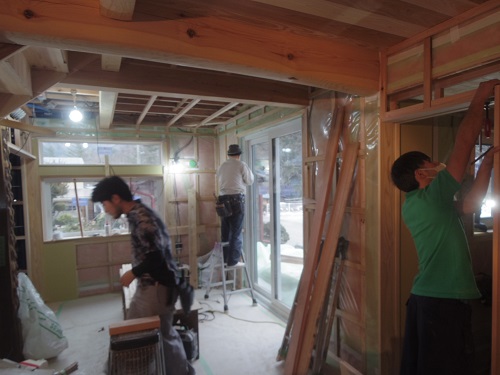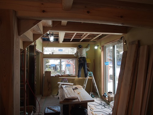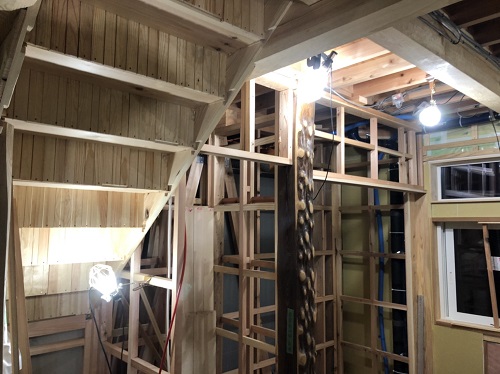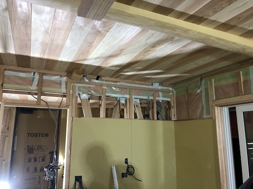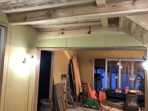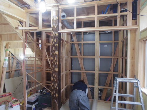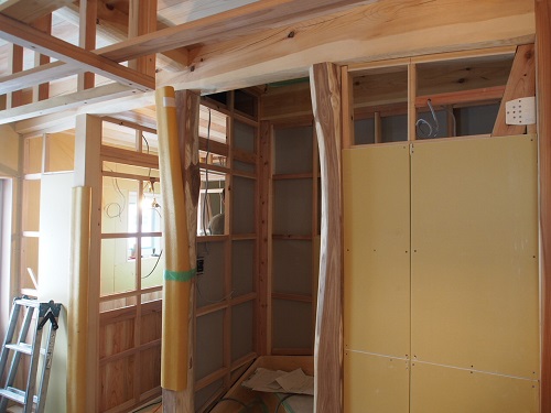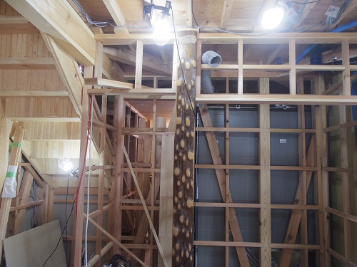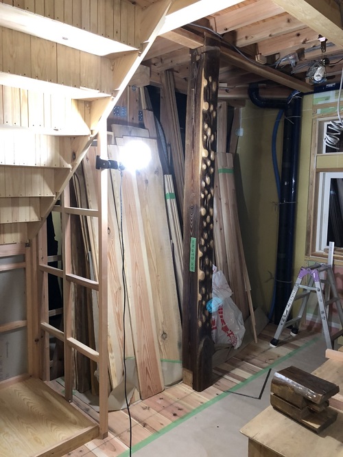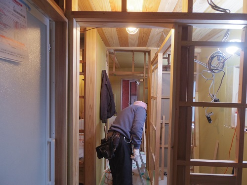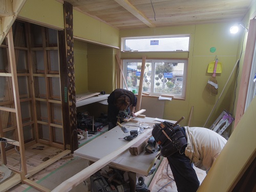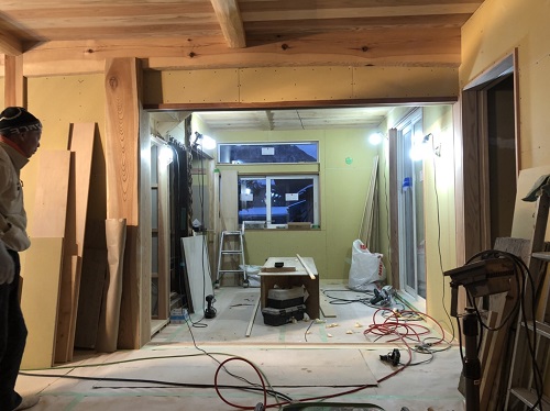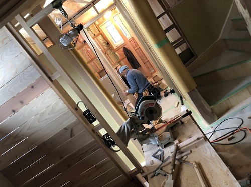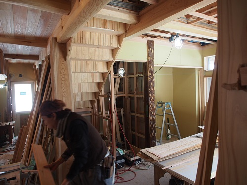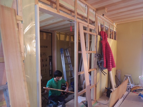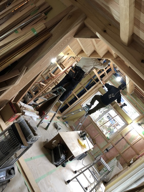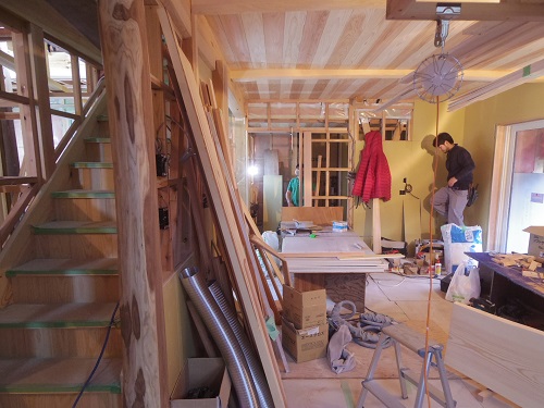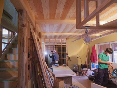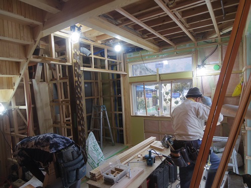 2階では内装工事が進んでいますが、1階では大工工事がまだまだ続いています。