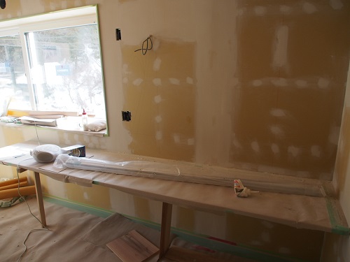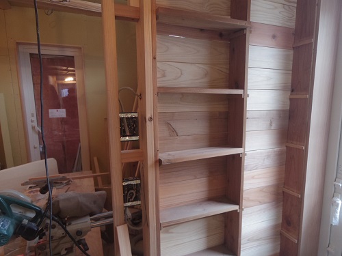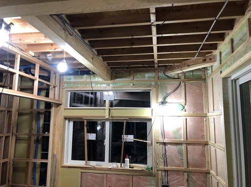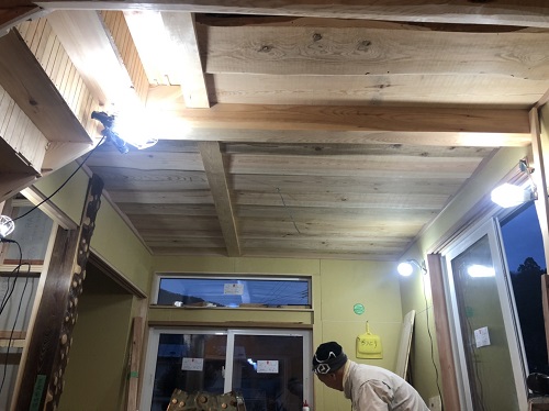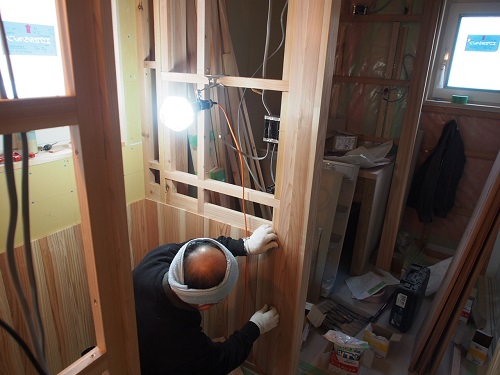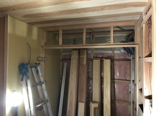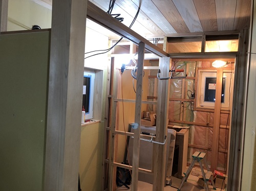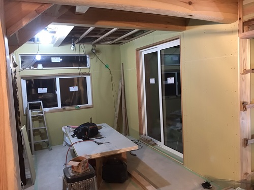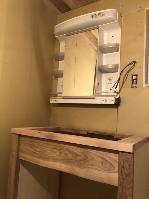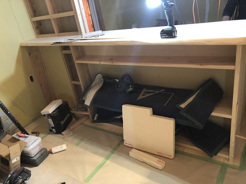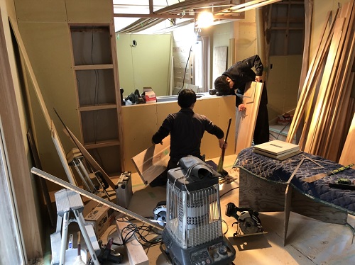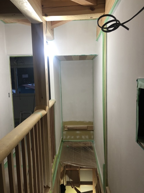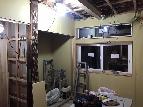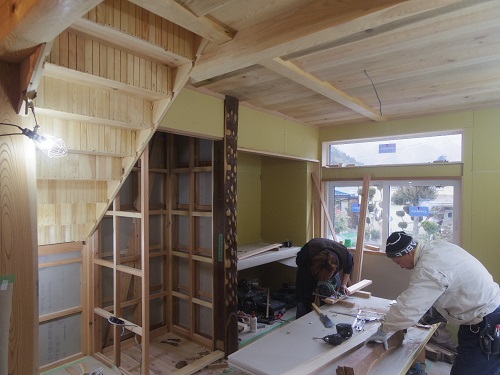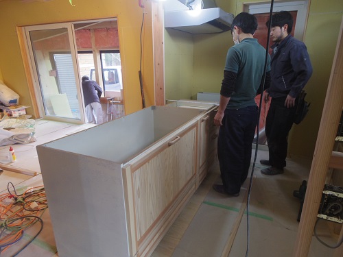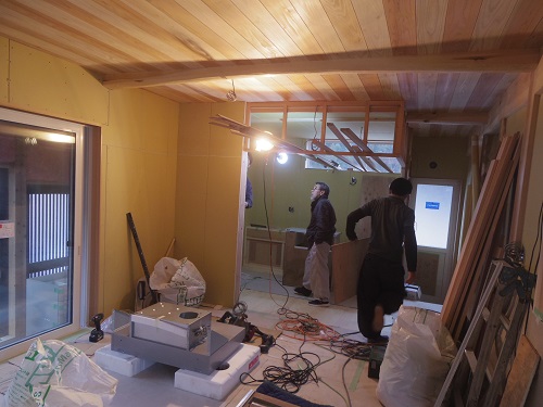 2階の内装も進み、木製に再生したシステムキッチンの取り付けなども進んでいます。