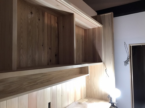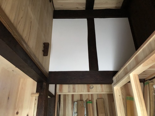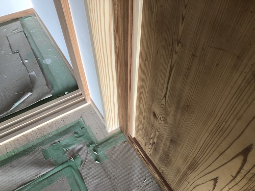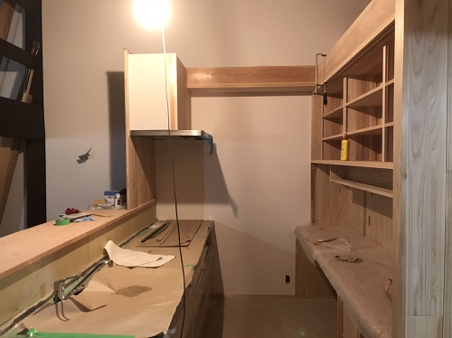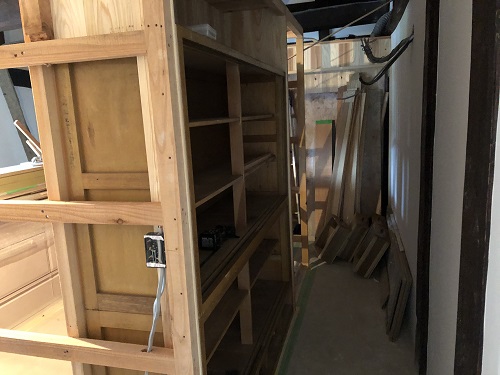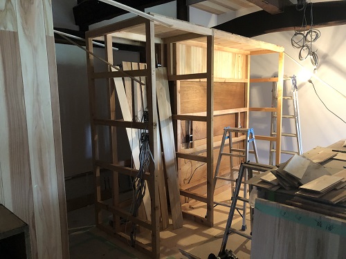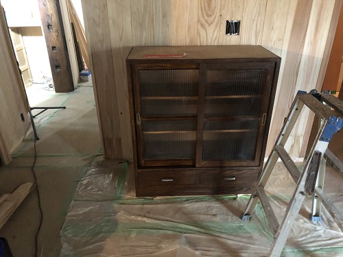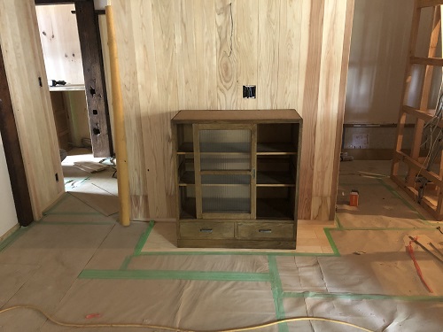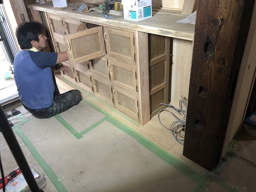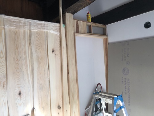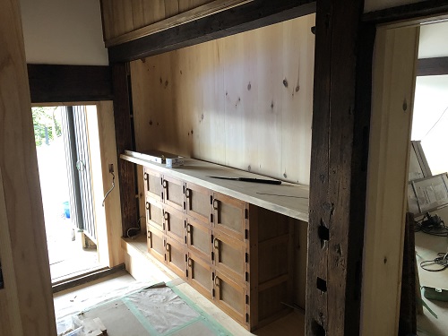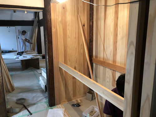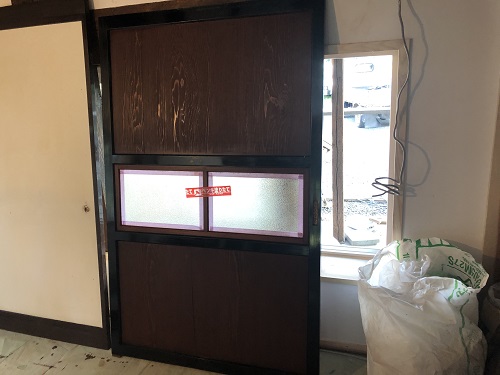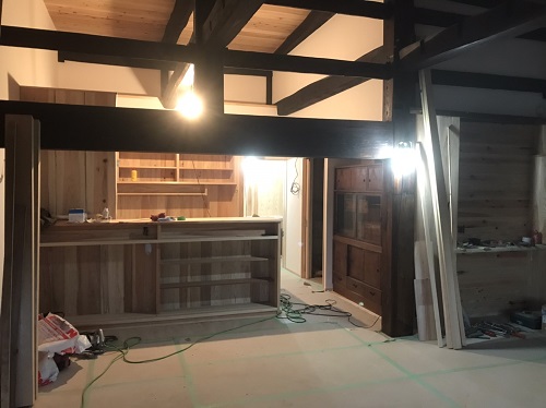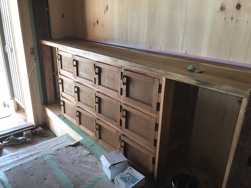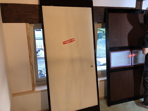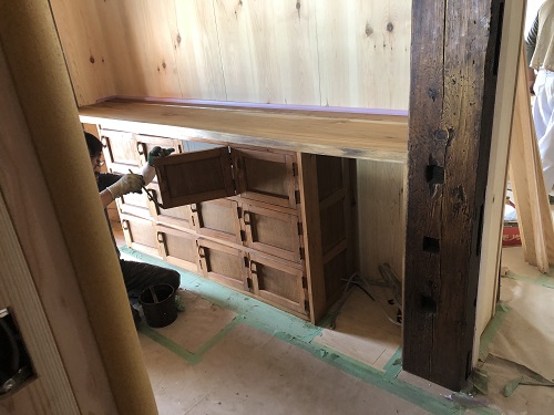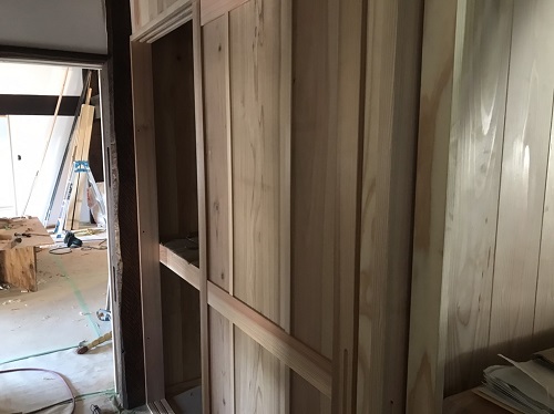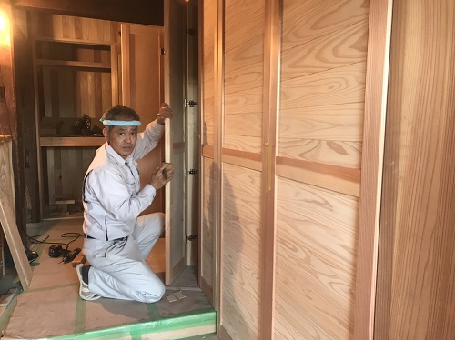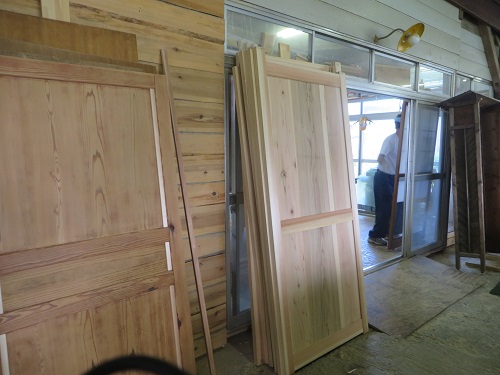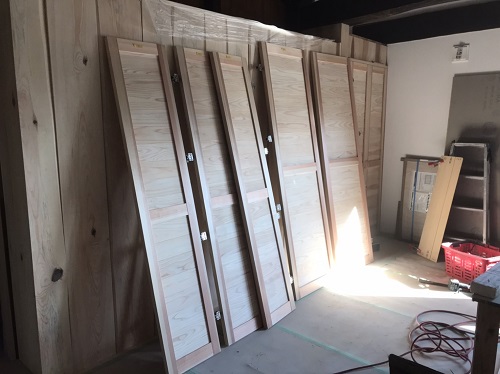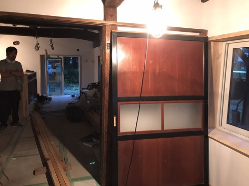 大改修現場の昨日です。古い収納棚類の再生品の設置も巣積み、今日は建具取付にも向かいました。