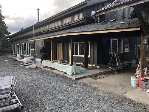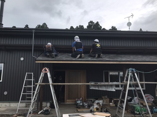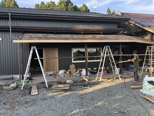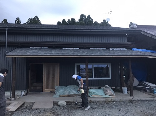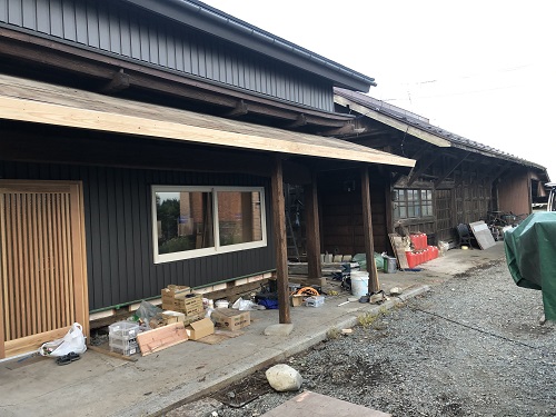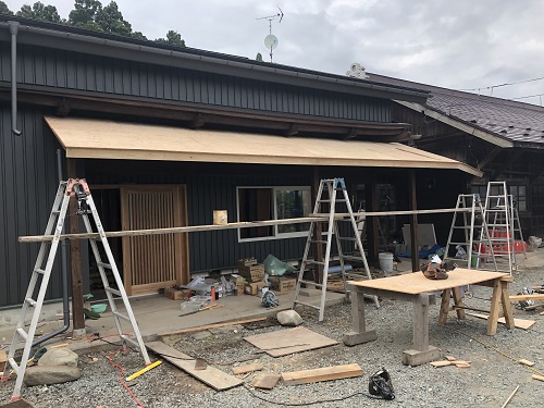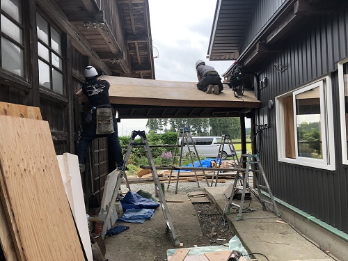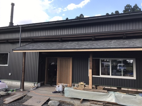 建具の吊り込みと玄関ポーチの屋根工事が始まりました。