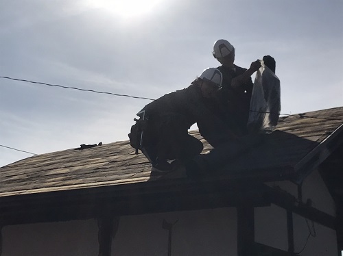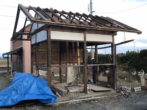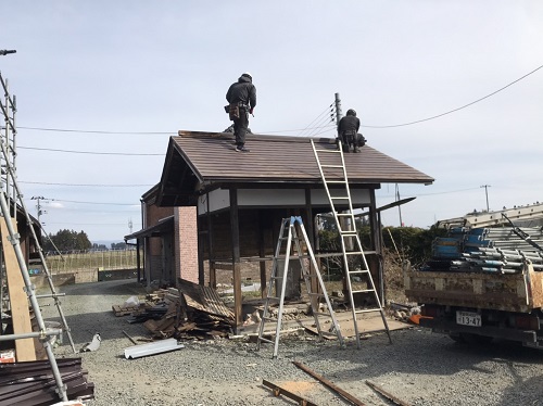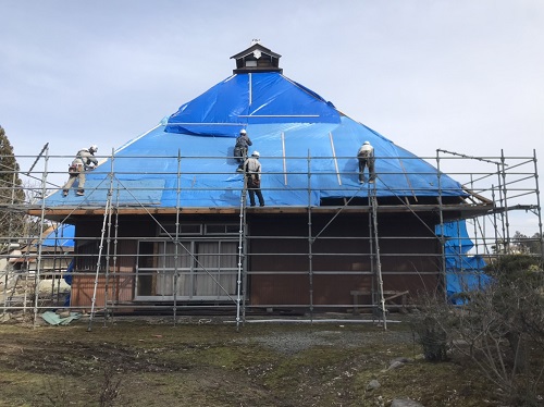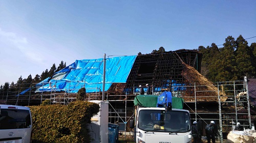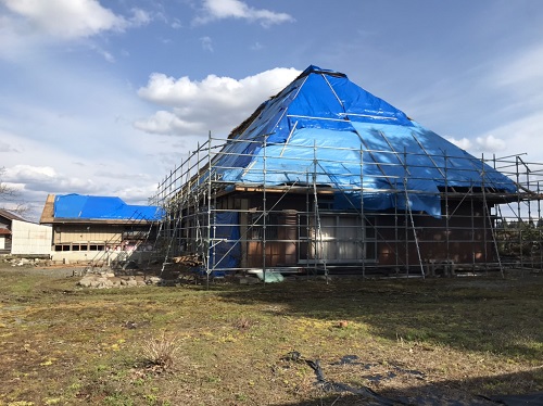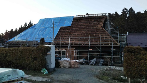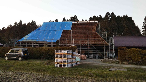 ブルーシートは屋根下に座敷があるので、濡らさないための用心です。
