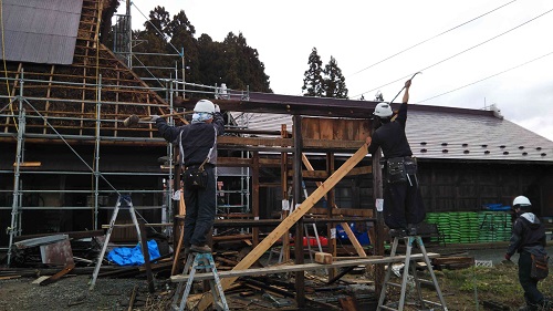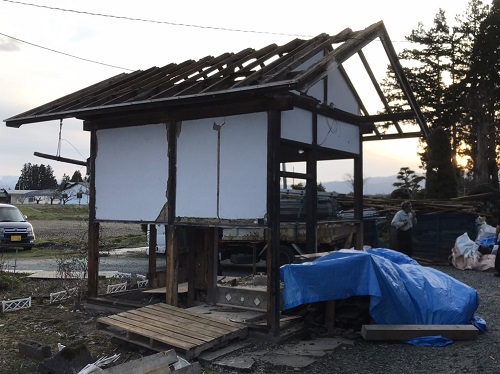 外風呂小屋の解体が進んだ大改修現場ですが、昨日の午前中はあめが降り、午後晴れたと思ったら、強風が吹き荒れて危険なので、内部養生のみ行って翌日の段取りを進めたところです。