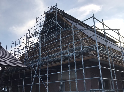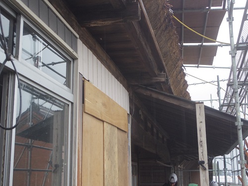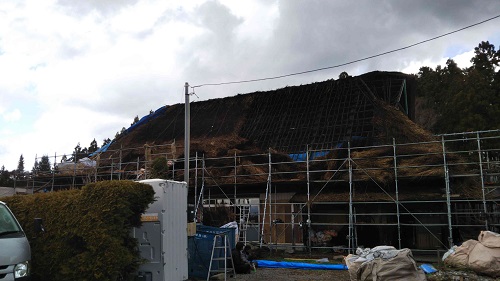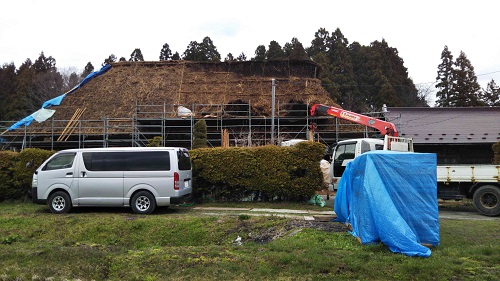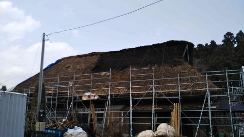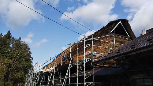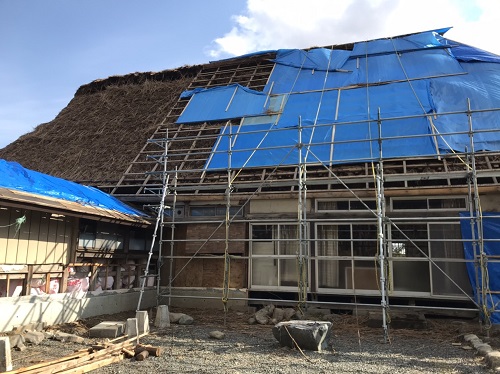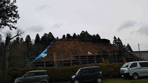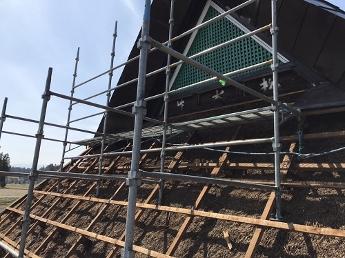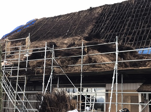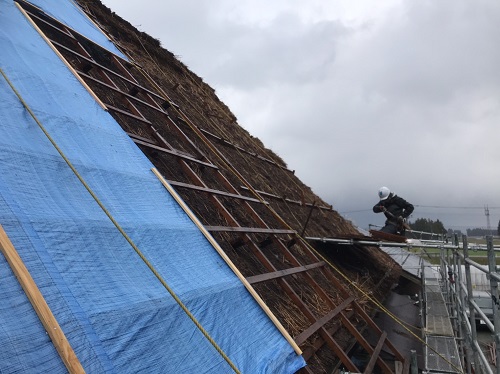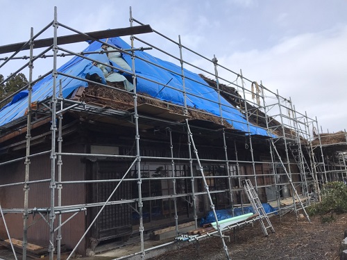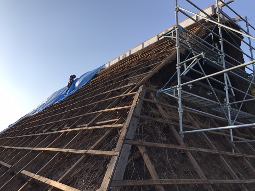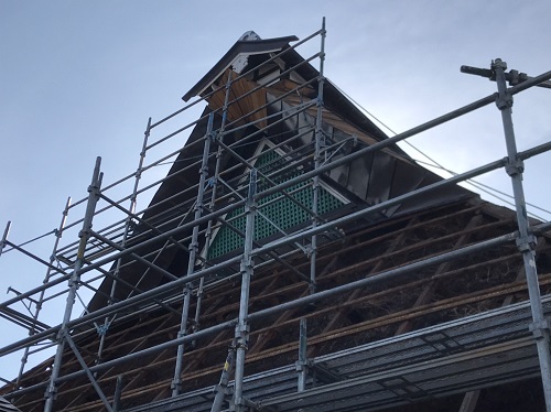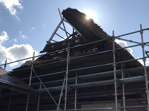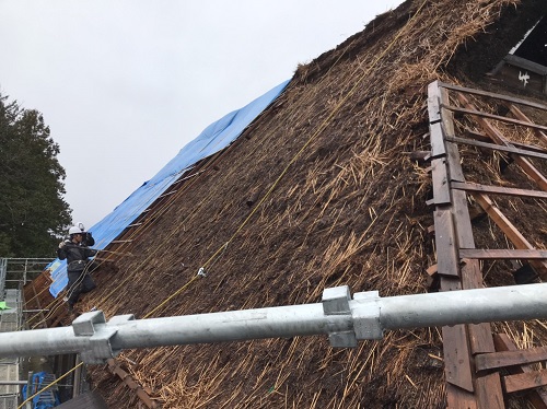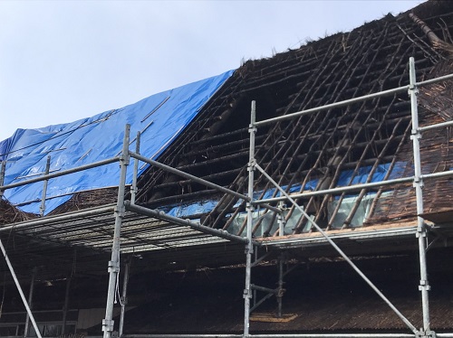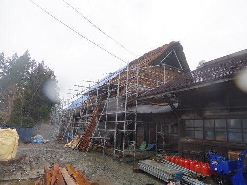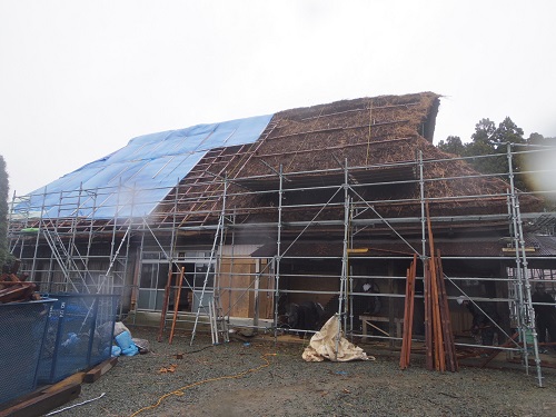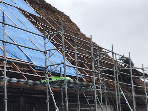昨日茅を外す予定でしたが、生憎の雨だったので、足場の組み換えなど茅外しの諸準備を進めた大改修現場です。