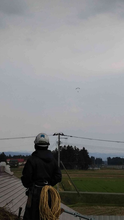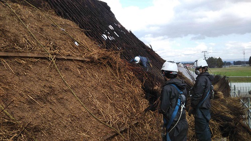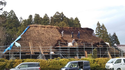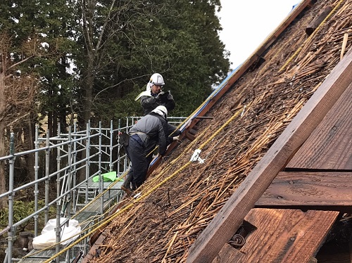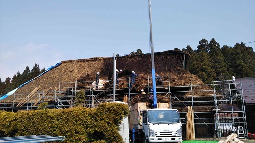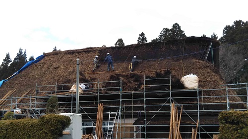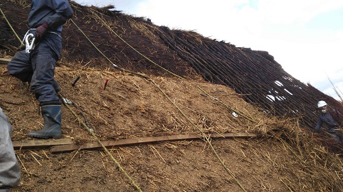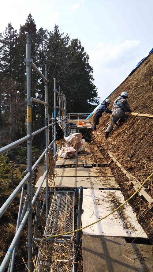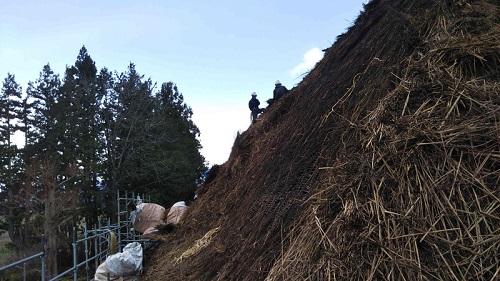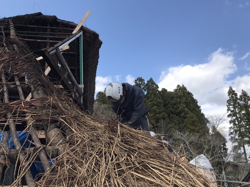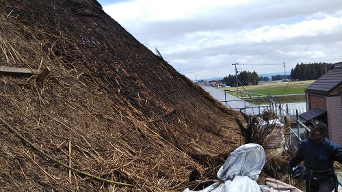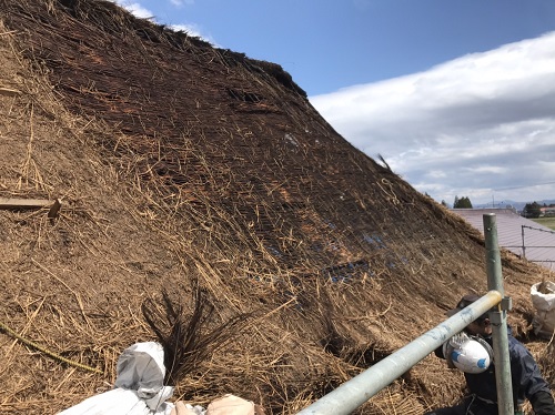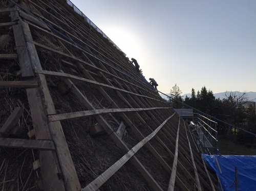 引き続きの茅外し風景ですが、正面南側は全て外れて次は裏手の北側の取り外しへと数む予定です。