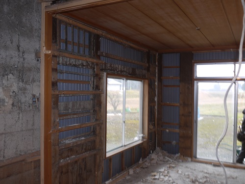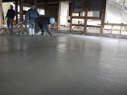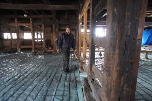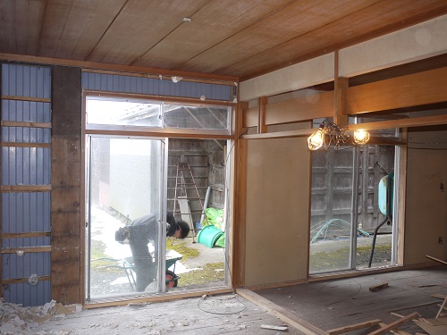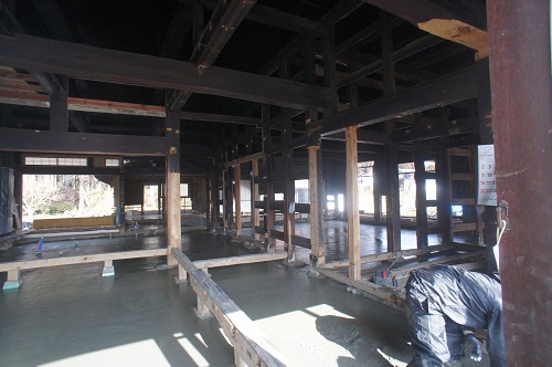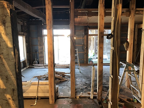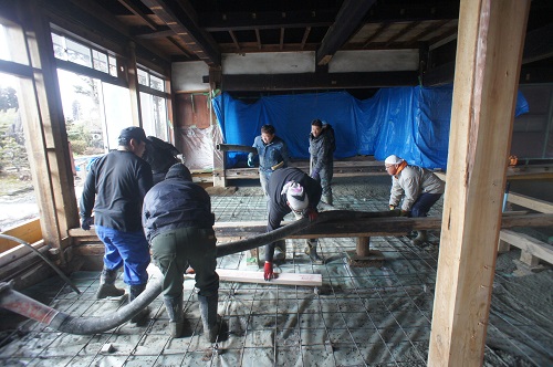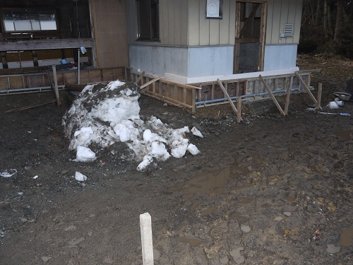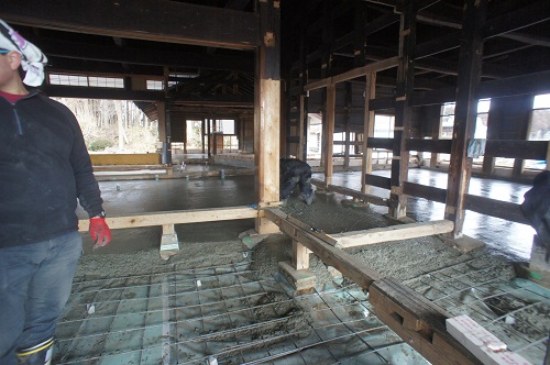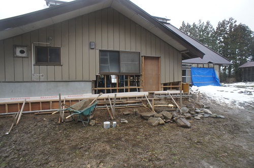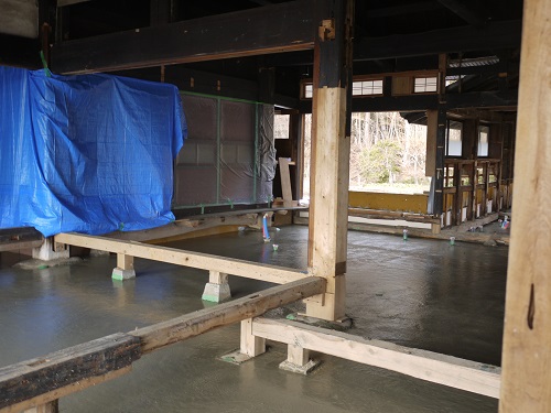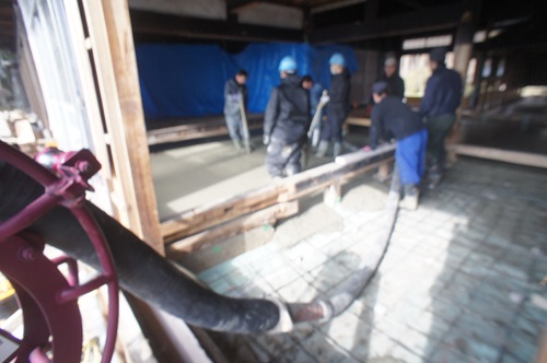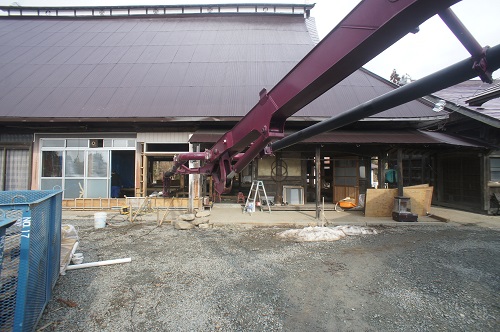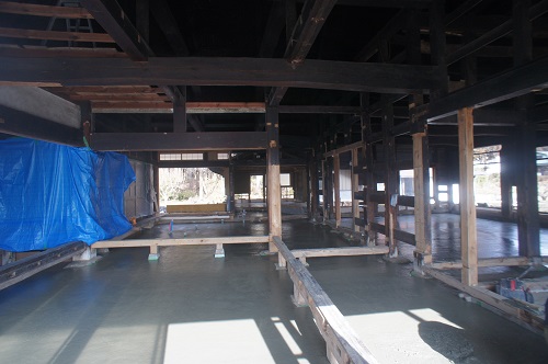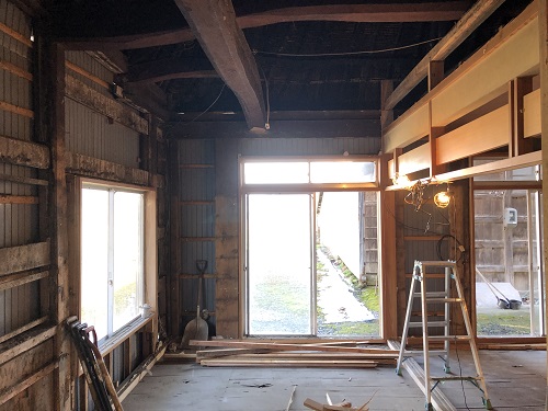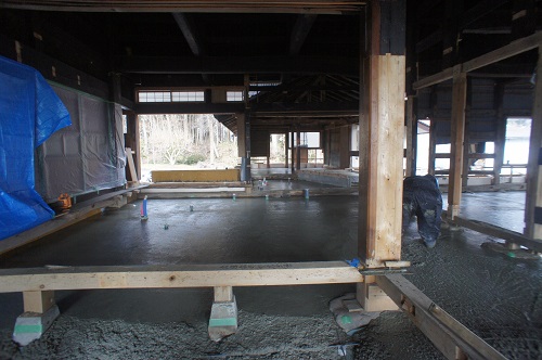 茅葺屋根古民家の大改修工事をしています。茅は外して現代的な屋根に造り替えになりますが、下の部屋の方は二世帯住宅に大改装となりますので、まずはこれまでの新建材で改装された部分の取り外し解体を行い、基礎補強のコンクリートの打設まで進みました。