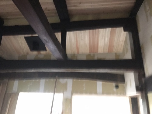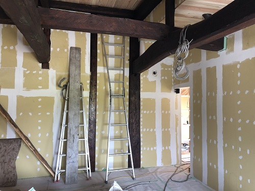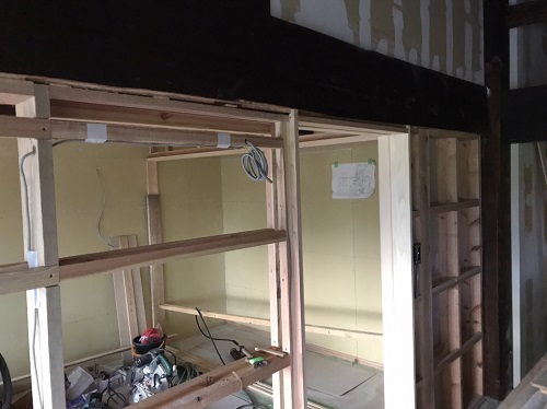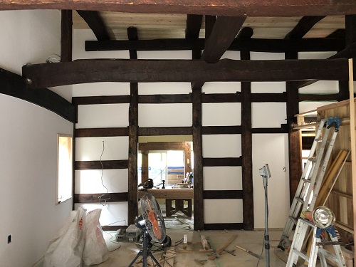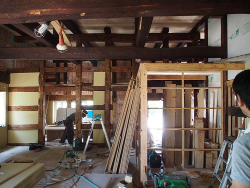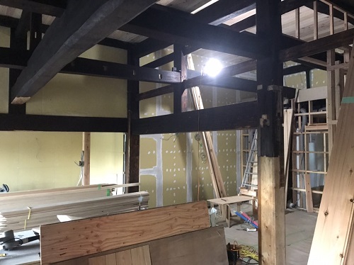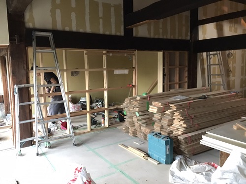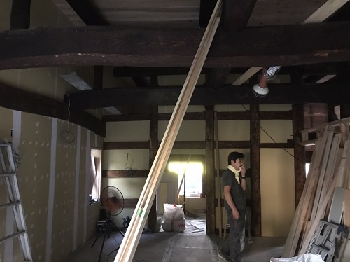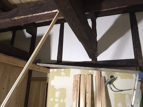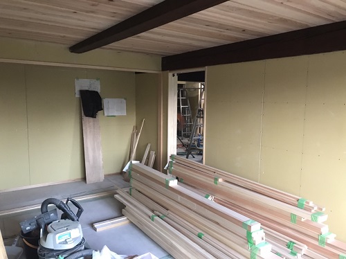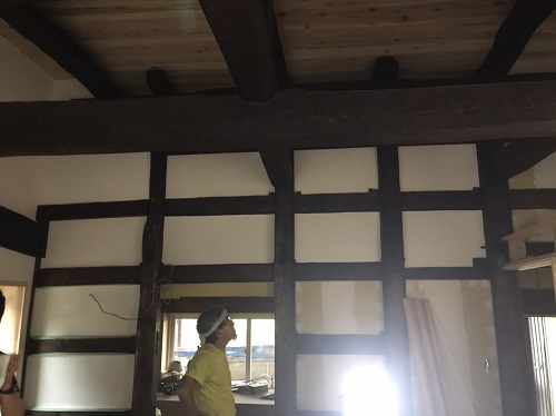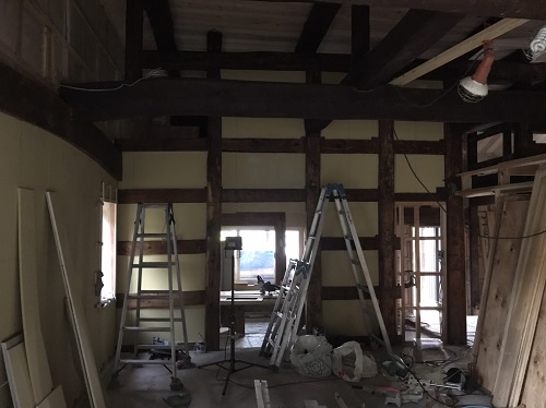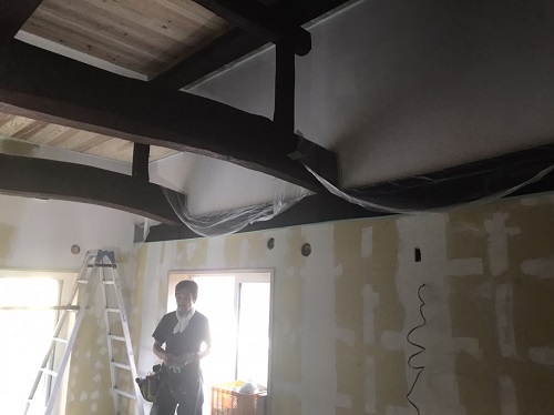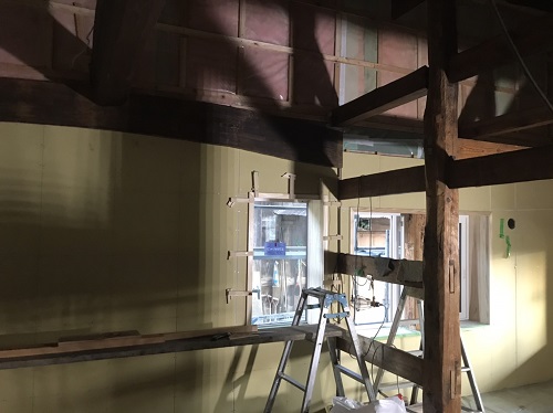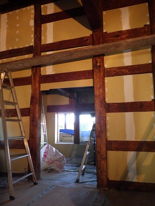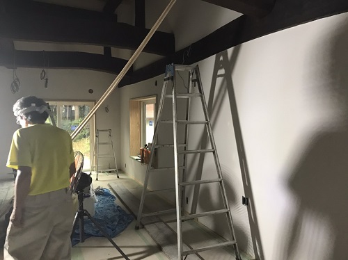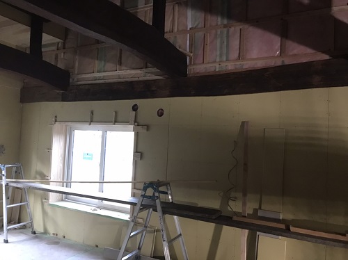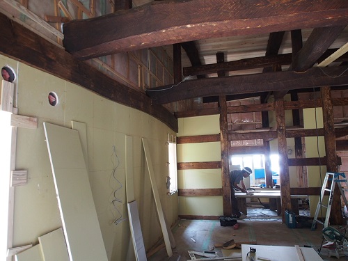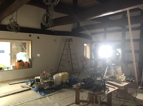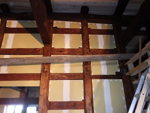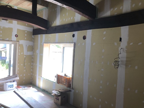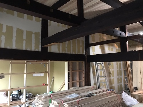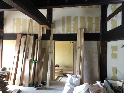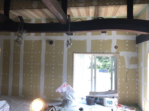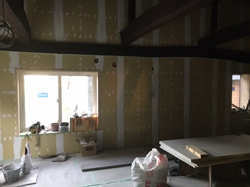 中笹間の大改修工事は、大工工事がまだ続きますが、内装のパテ打ち出来るところは同時進行で進めています。