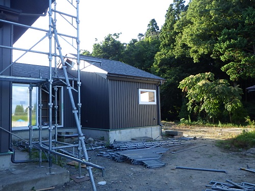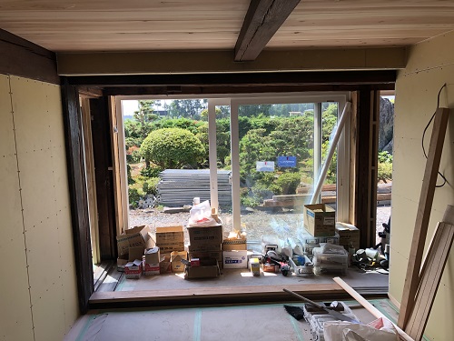 水回りの板壁の張込みや外部足場の取り外しが進み、内装が随時進行の大改修現場です。