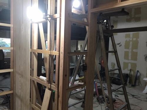大改修工事は、大工工事が大方になってきていますが。造作カウンター工事類がまだ引き続きあります。