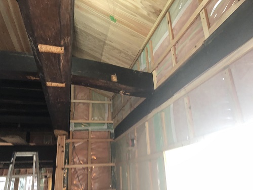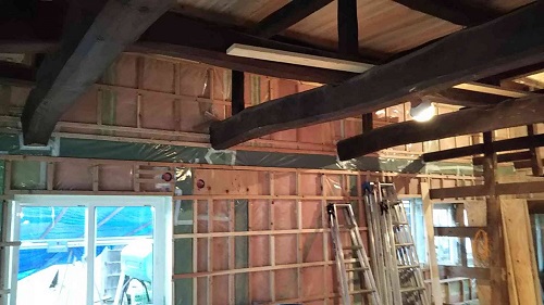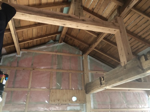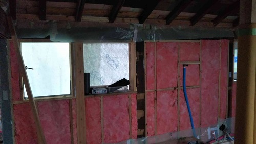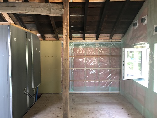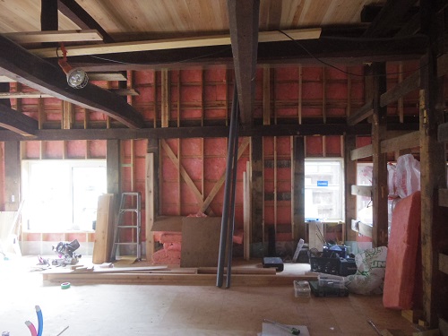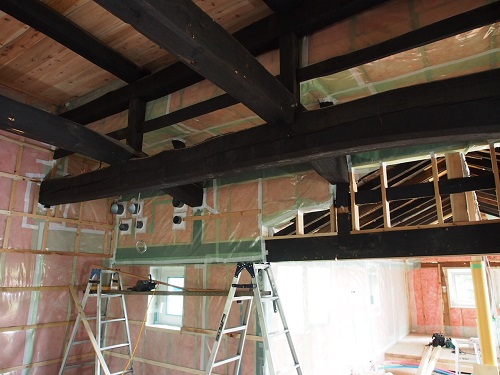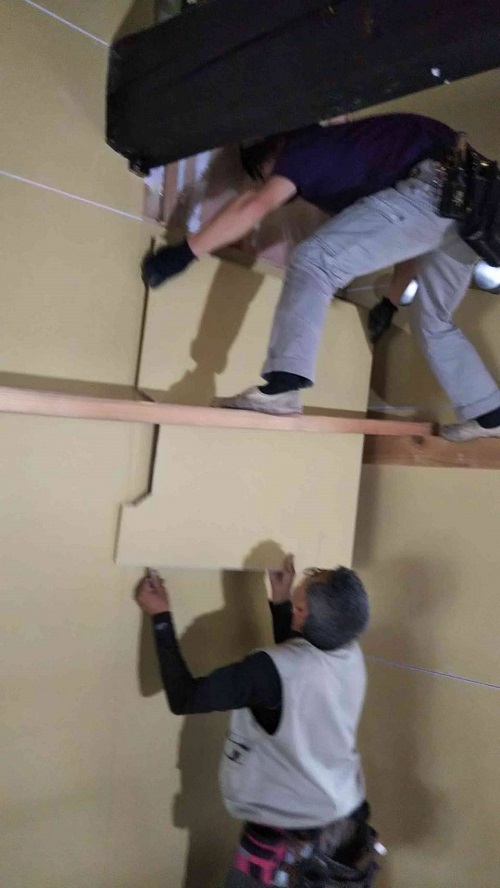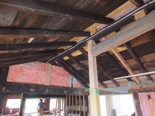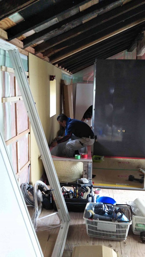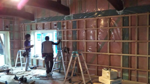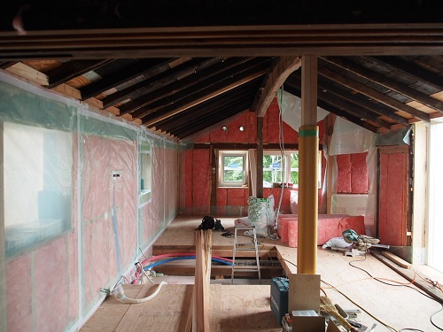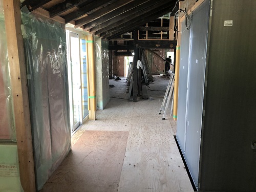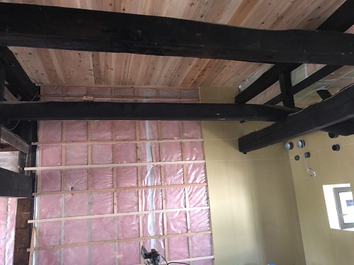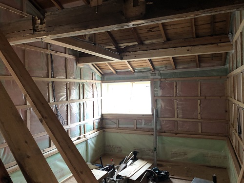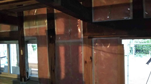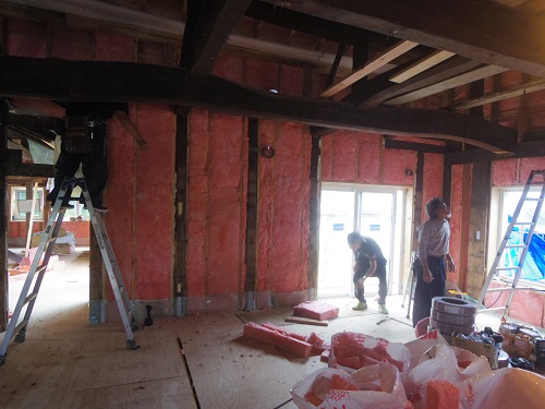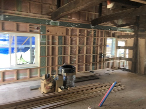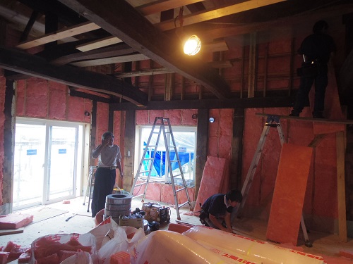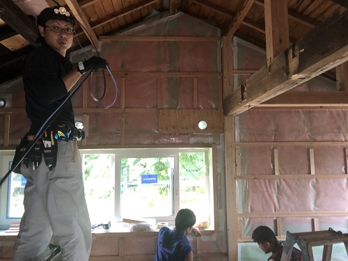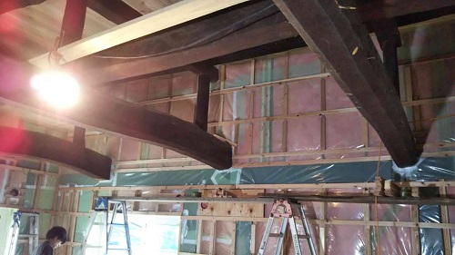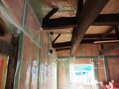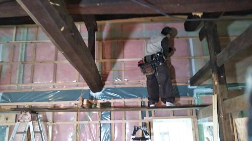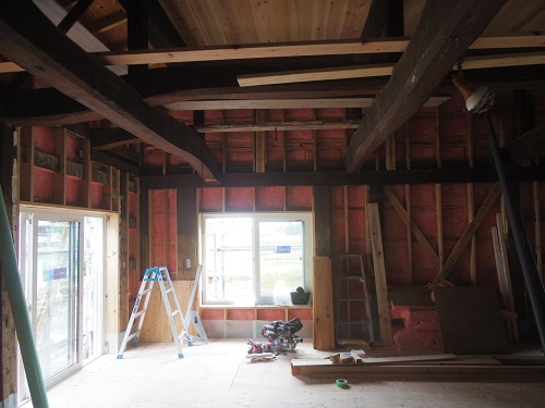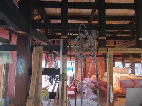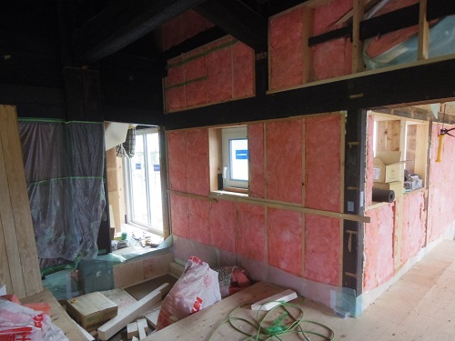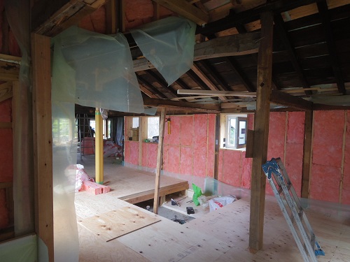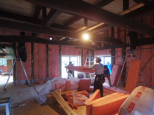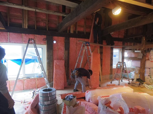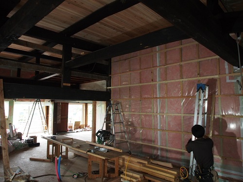 大雨の日は、外部が出来ないので、内部で断熱工事が進みました。大改修でも新築に変わらず壁は200mmの厚さの断熱が入ります。