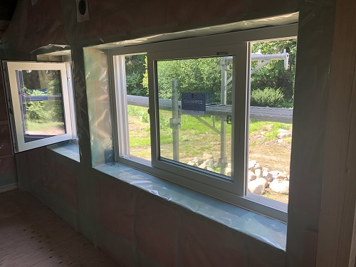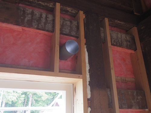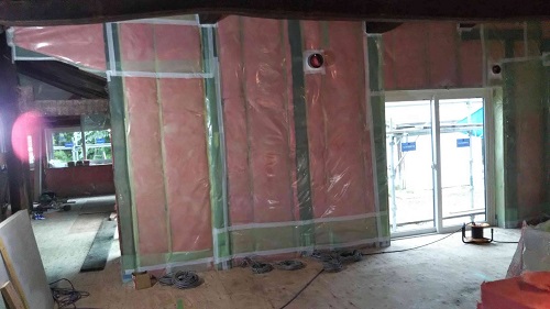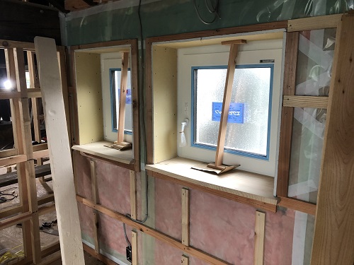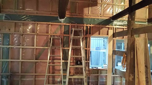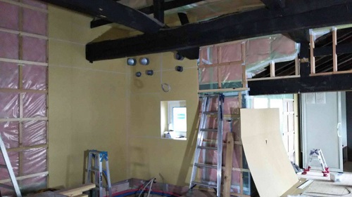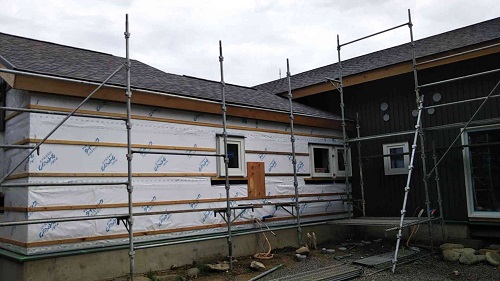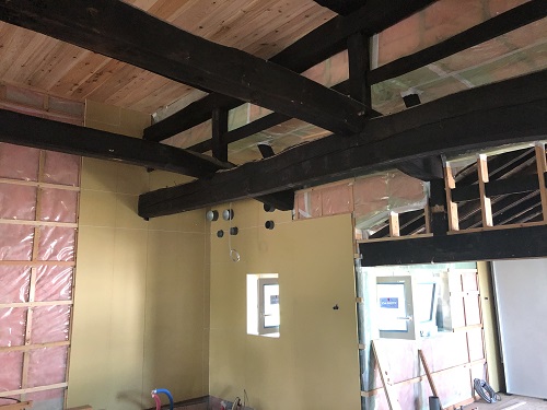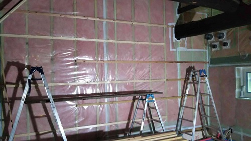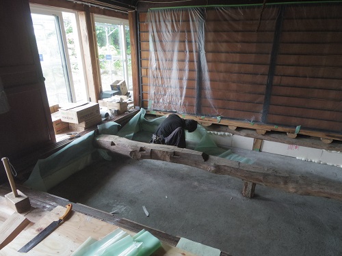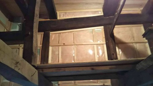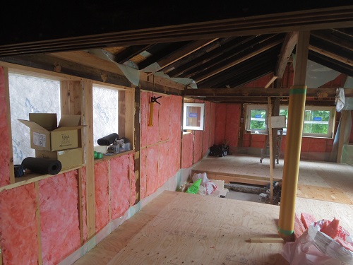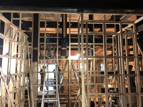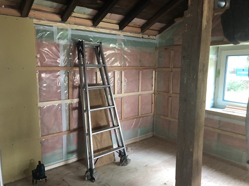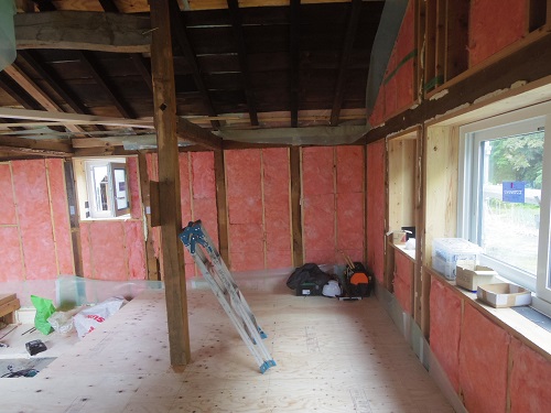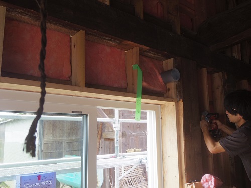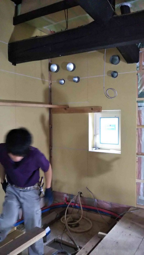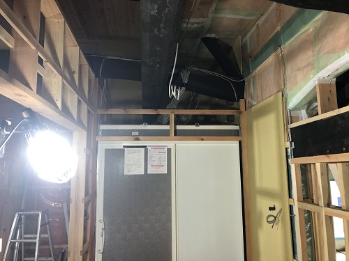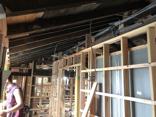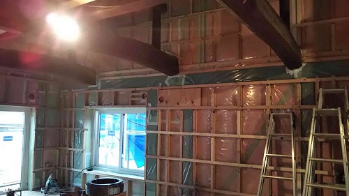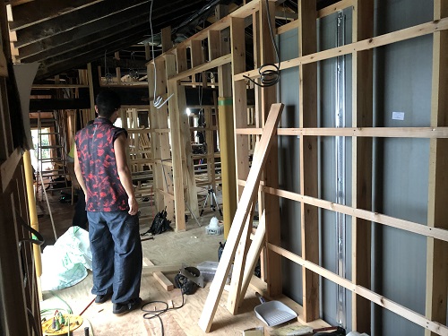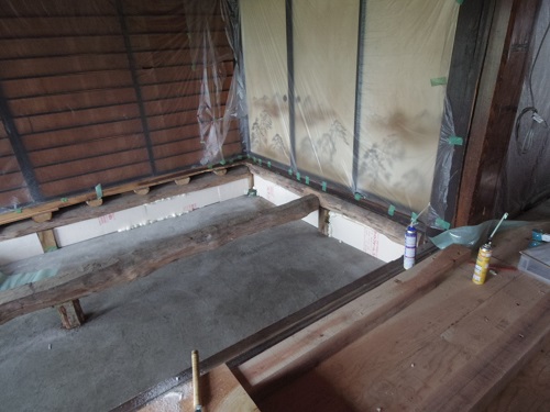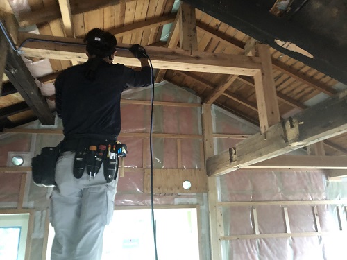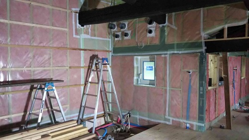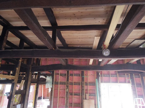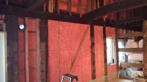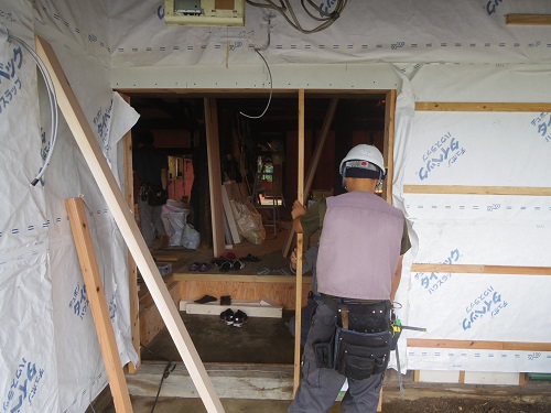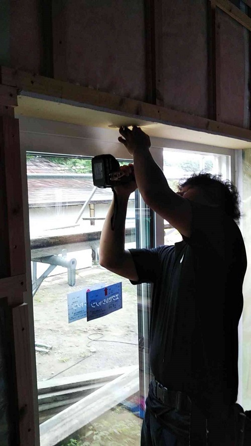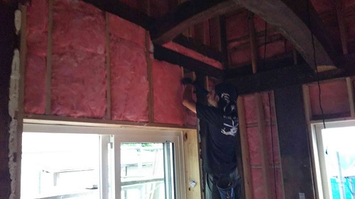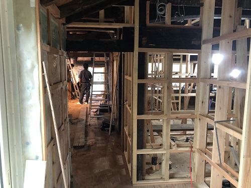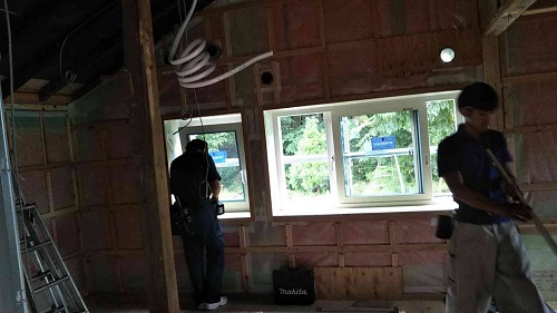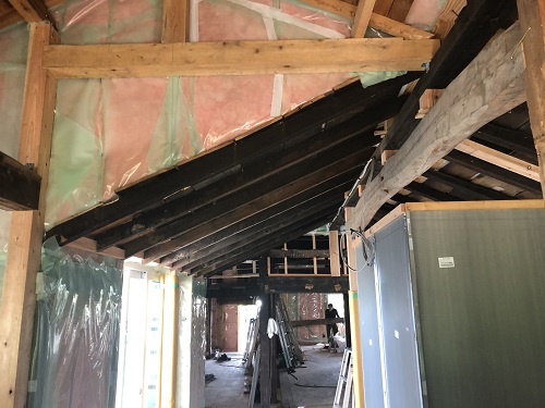 大雨の日は、外部が出来ないので、内部で断熱工事が進みました。大改修でも新築に変わらず壁は200mmの厚さの断熱が入ります。