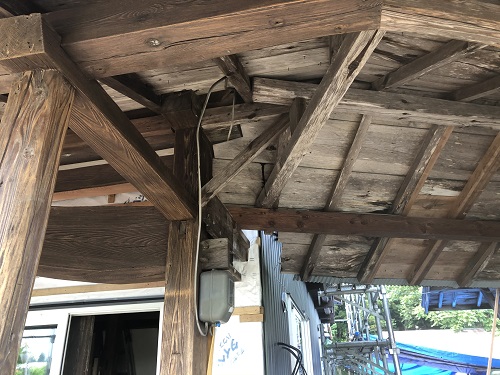 昔の木組みが良い感じの玄関脇のアプローチです。雨でも雪でも濡れずに車から降りて玄関まで歩けるのは昔も今も誰もが得たい部分ですね。