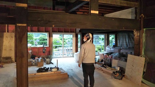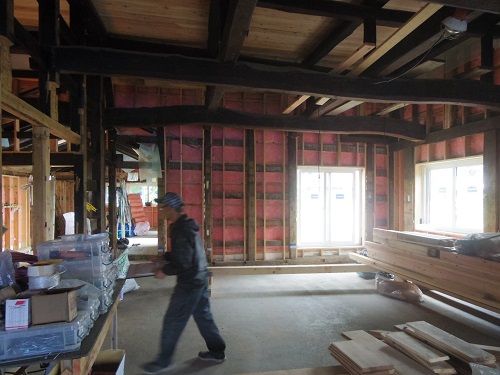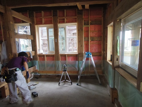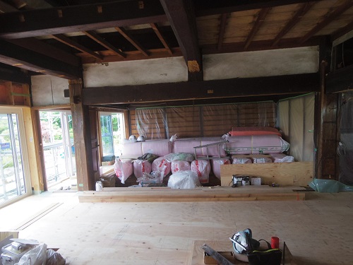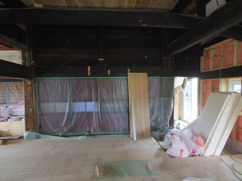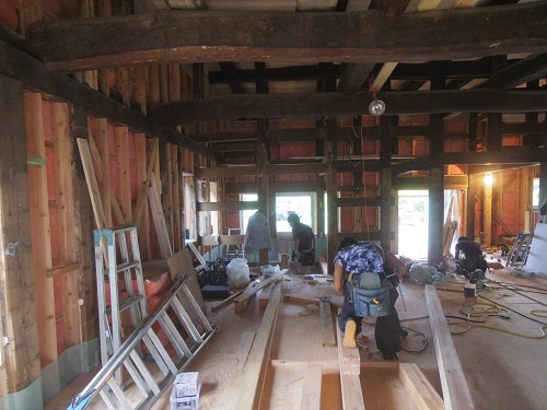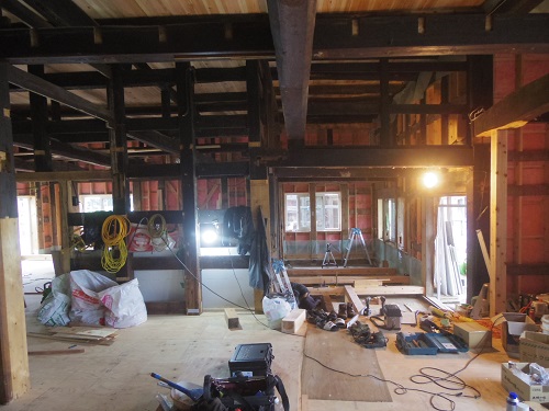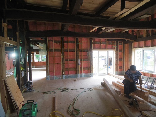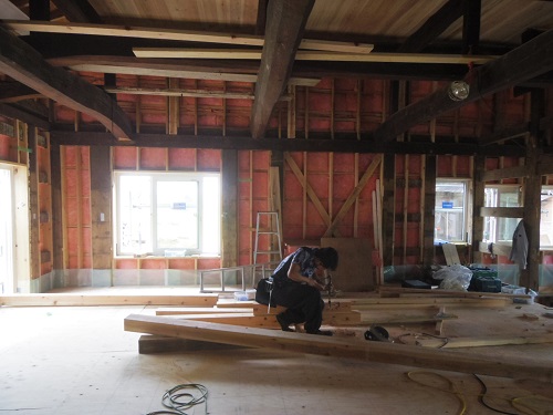 中笹間の大改修工事現場では、内部の床下地組を進め、外壁工事の段取りも進めています。