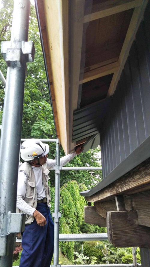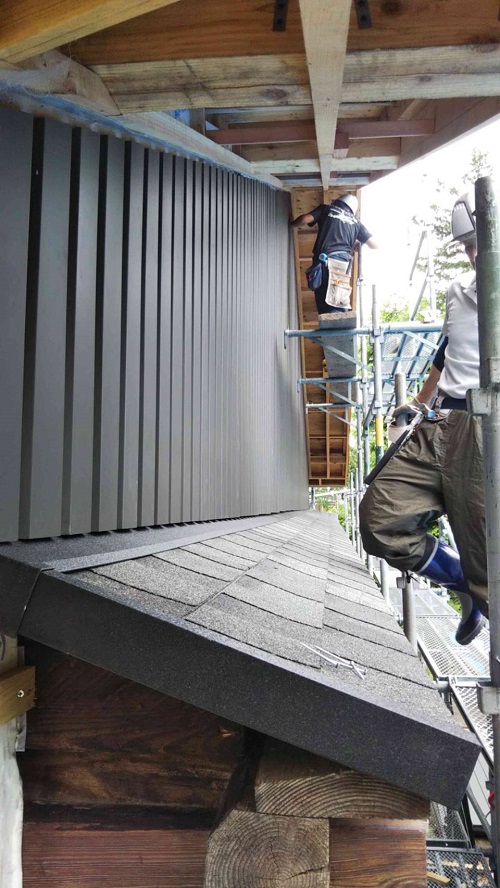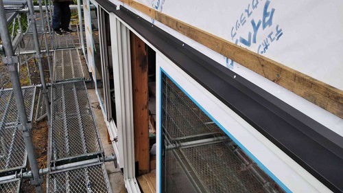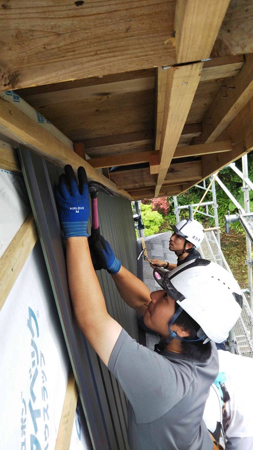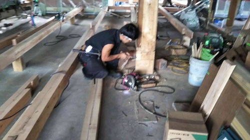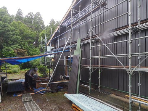 外壁工事の段取り板金や内部の床組み工事の先行段取りが進む大改修現場です。