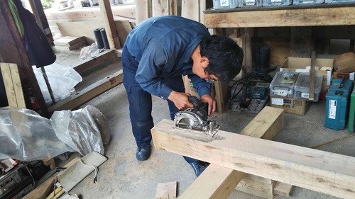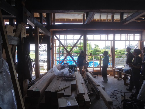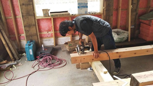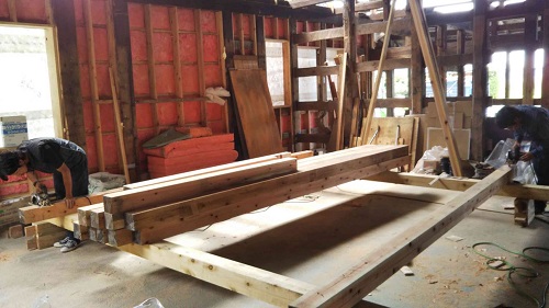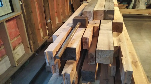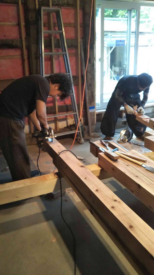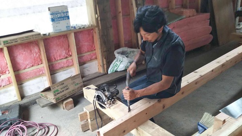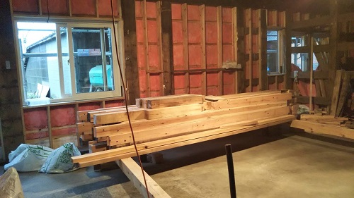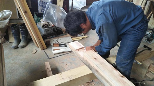 中笹間も雨だったので、内部で床組構造材の刻みを進めました。