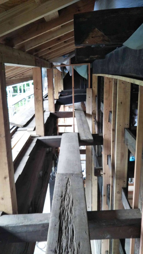 雨の日も滞ることなく工事を進めていますが、大きさと100年の微妙なよれへの対応で苦労しています。