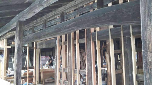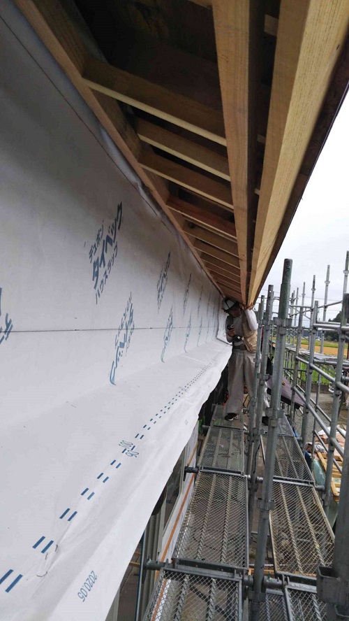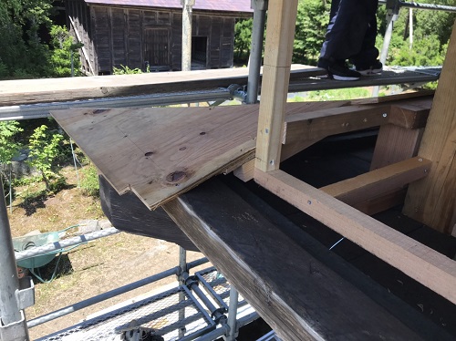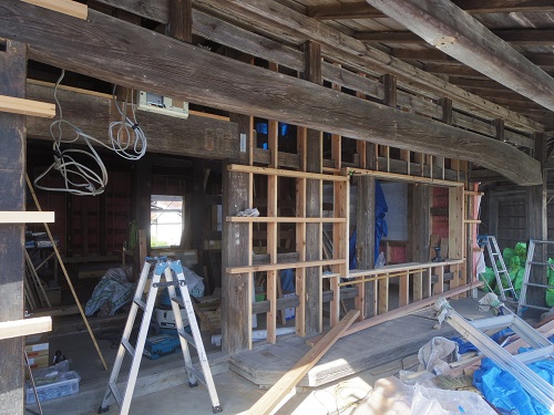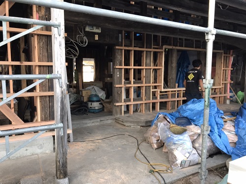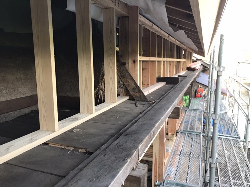 軒天井の通気部分に防虫ネットを張って、基礎の不陸をモルタルで補修しながら、雨が降ると内部に入って大引きの刻みを進めた大改修現場です。