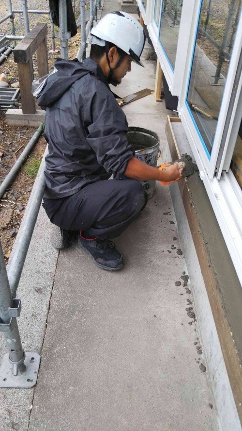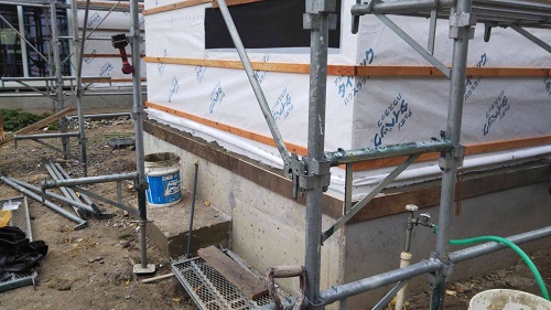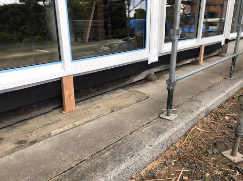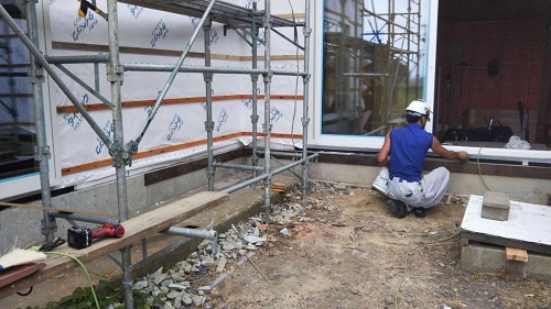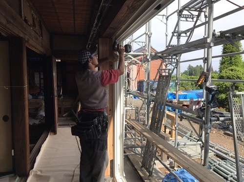 サッシの取り付けなど外部工事が進んでいる大改修現場です。