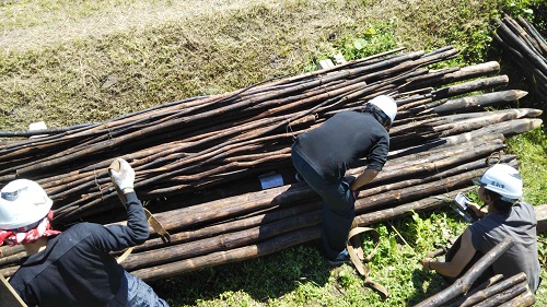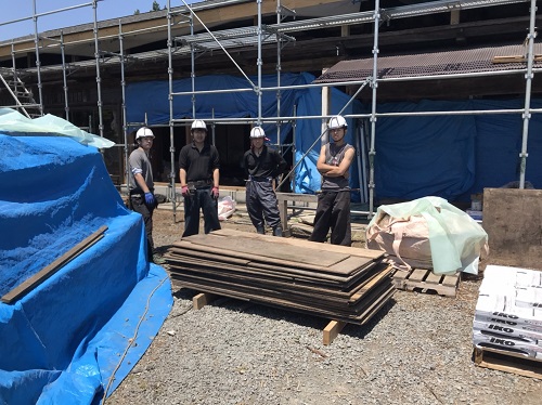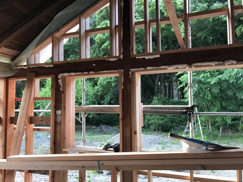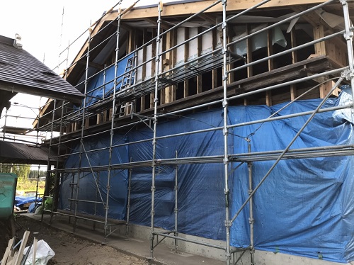 外した茅葺き屋根の下地材をようなやく全て運び出すことが出来ました。外周部の足場も付け直して引き続きの工事態勢を整えました。